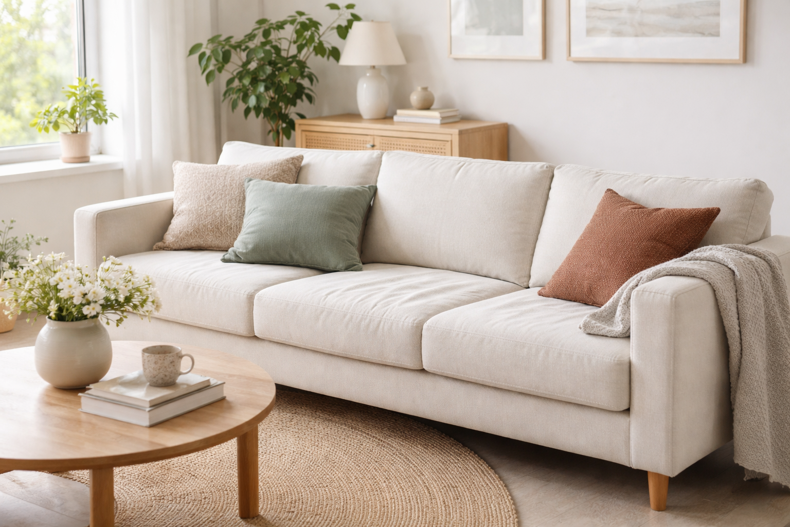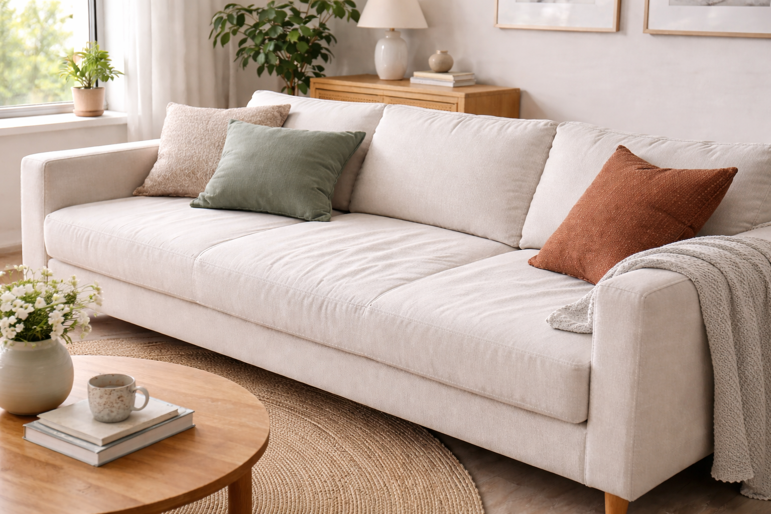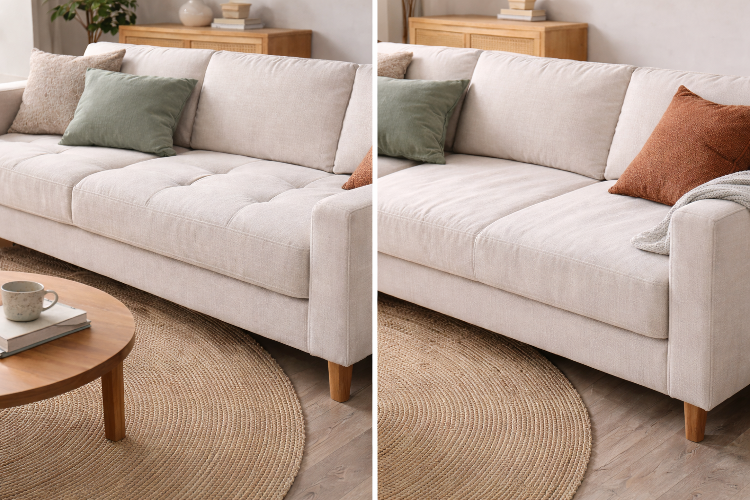 Sohva ei pysy täysin muuttumattomana käytössä – eikä sen tarvitsekaan. Pehmuste asettuu, kangas elää ja istuin muotoutuu kuormituksen mukaan. Tämä kuuluu materiaalien normaaliin käyttäytymiseen.