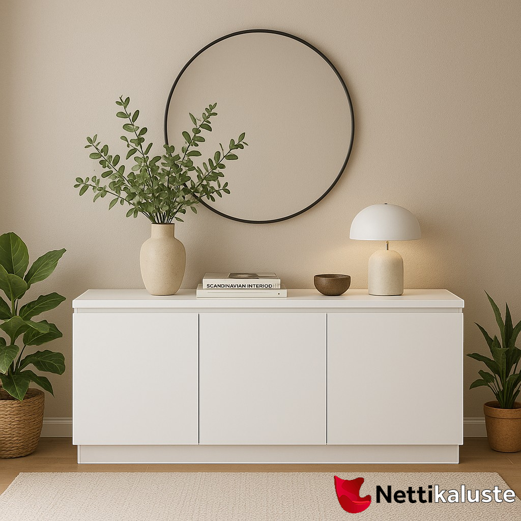 Line 8 tasossa on 3 umpiovikaappia monenlaiseen säilytykseen. Jokaisessa kaapissa on 1 korkeussäädettävä puuhylly. Voit valita tason sokkelilla tai 13 cm metallijaloilla. Erinomainen valinta tv-tasoksi tai matalaksi senkiksi kodin kaikkiin tiloihin.