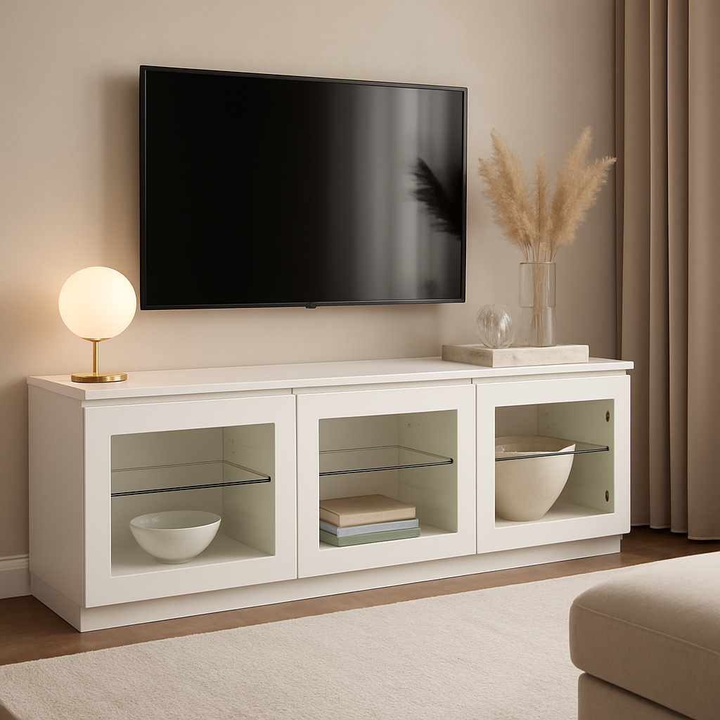 Line 9 tasossa on 3 lasikaappia monenlaiseen säilytykseen. Jokaisessa kaapissa on 1 korkeussäädettävä puuhylly. Voit valita tason sokkelilla tai 13 cm metallijaloilla. Erinomainen valinta tv-tasoksi tai matalaksi senkiksi kodin kaikkiin tiloihin.