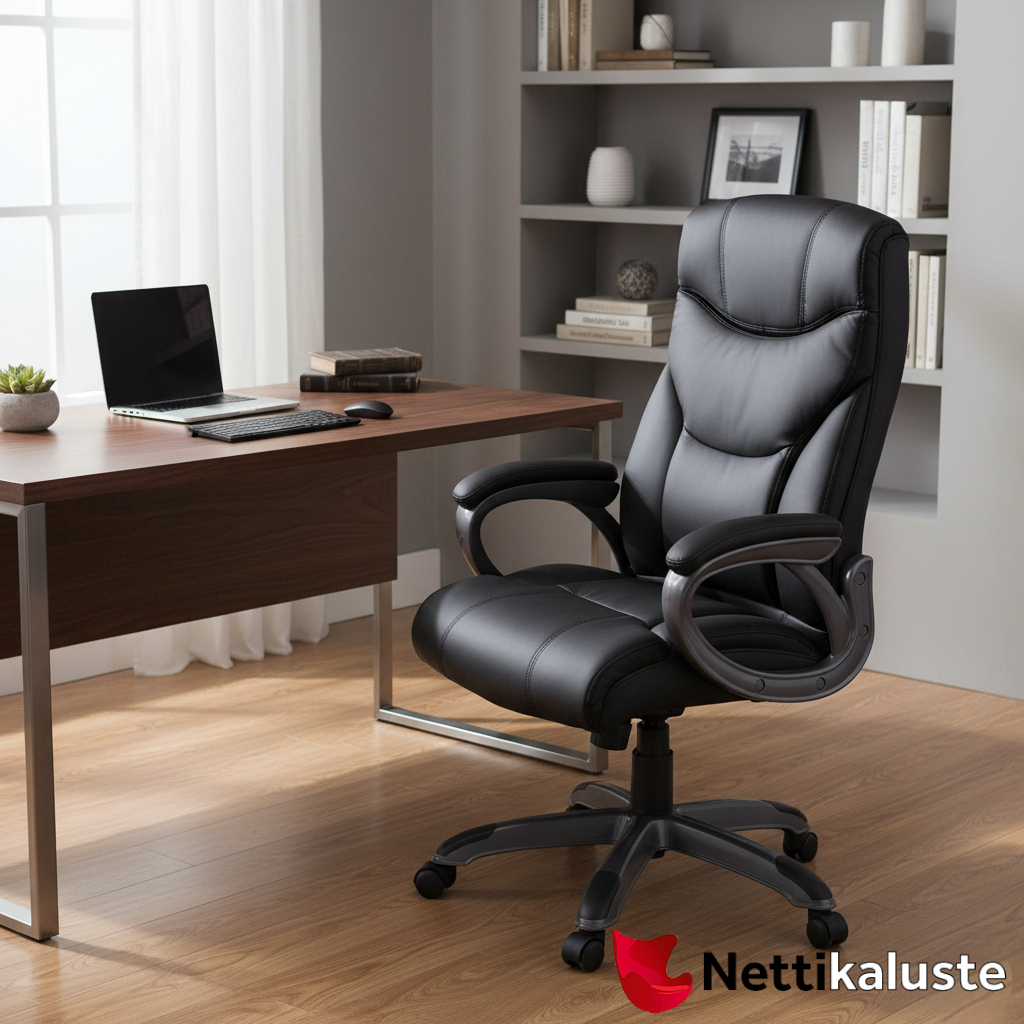 Keinonahkaverhoiltu työtuoli synkromekanismilla ja pehmustetuilla käsinojilla.