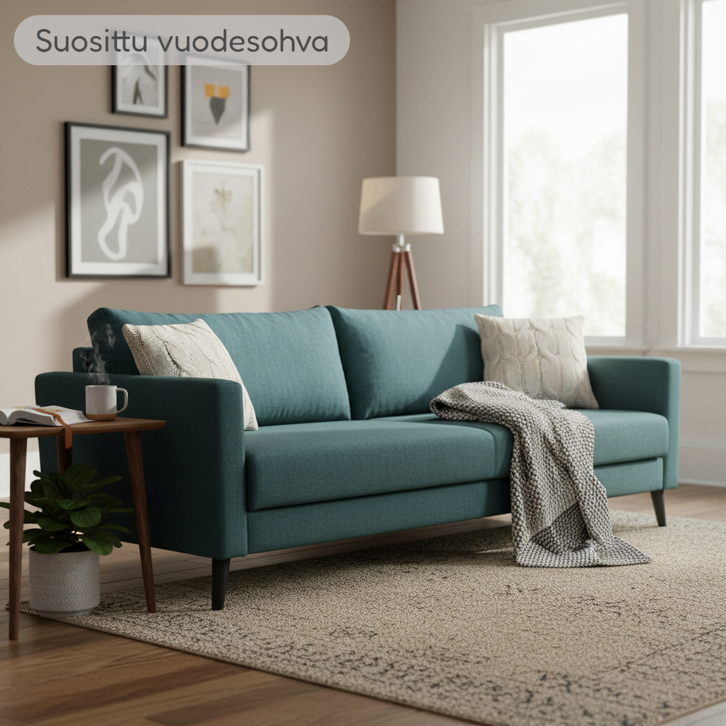 Vihreä sävy tuo olohuoneeseen rauhaa ja luonnollista ilmettä. Se toimii pehmeänä katseenvangitsijana ja istuu luontevasti vaaleiden pintojen, puun ja hillittyjen tekstiilien rinnalle. Korkeat 16 cm puujalat helpottavat siivousta ja pitävät kokonaisuuden kevyen näköisenä.