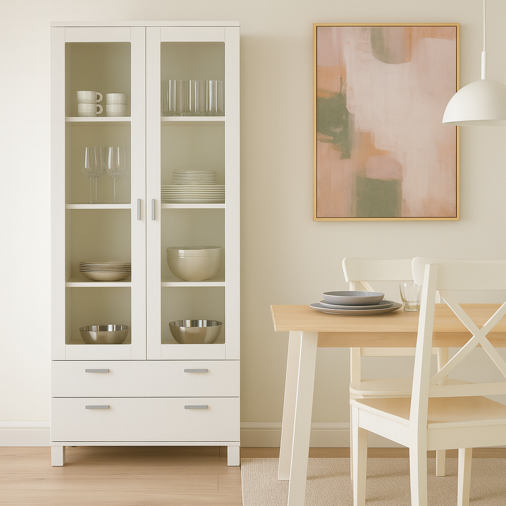 Kahdella lasiovella ja kahdella vetolaatikolla varustettu Korkealaatuisen Fondi-tuotesarjan lasiovivitriini tarjoaa paitsi käytännöllisyyttä myös esteettistä nautintoa. Voit valita lasioviesi tyylin - kirkkaat lasit tuovat avoimuutta, kun taas himmeämpi maitolasi tarjoaa hienostunutta yksityisyyttä. Kolme korkeussäädettävää hyllyä lasiovien takana antavat joustavuutta erilaisten esineiden asetteluun ja esittelyyn.