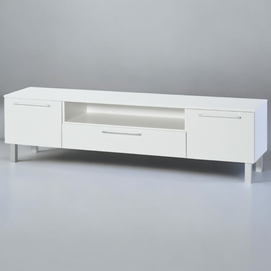 Ajaton ja klassinen Lumme TV-taso sopii suomalaiseen kotiin. TV-tasossa on yksi leveä vetolaatikko, kaksi tilavaa ovikaappia ja yksi leveä avohylly.