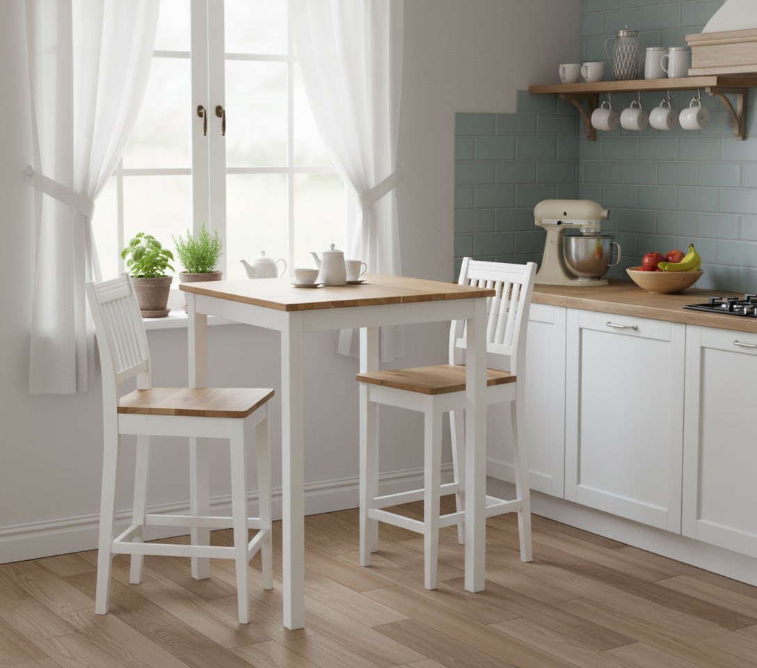 Rustiikki baariryhmässä on kaksi tyylikästä baarituolia ja yksi pöytä. Baaripöytä on oiva valinta pieneen keittiöön tai ruokailutilaan. Tyylikäs tammen ja valkoisen yhdistelmä sopii moneen sisustusmakuun.