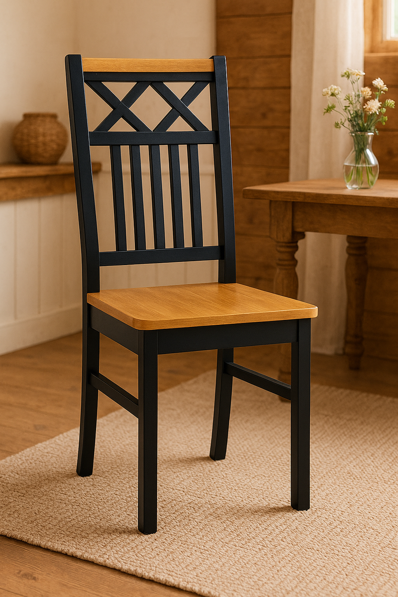 Ajattoman kauniissa Emilia ruokatuolin selkänojassa on kaunis ristikkoaihe. Tuoli on helppo yhdistää erilaisiin ruokapöytiin. Tuolissa on yhdistetty tyylikkäällä tavalla mustaa ja rustiikkitammea. Tukeva emilia tuoli on valmistettu massiivikoivusta.