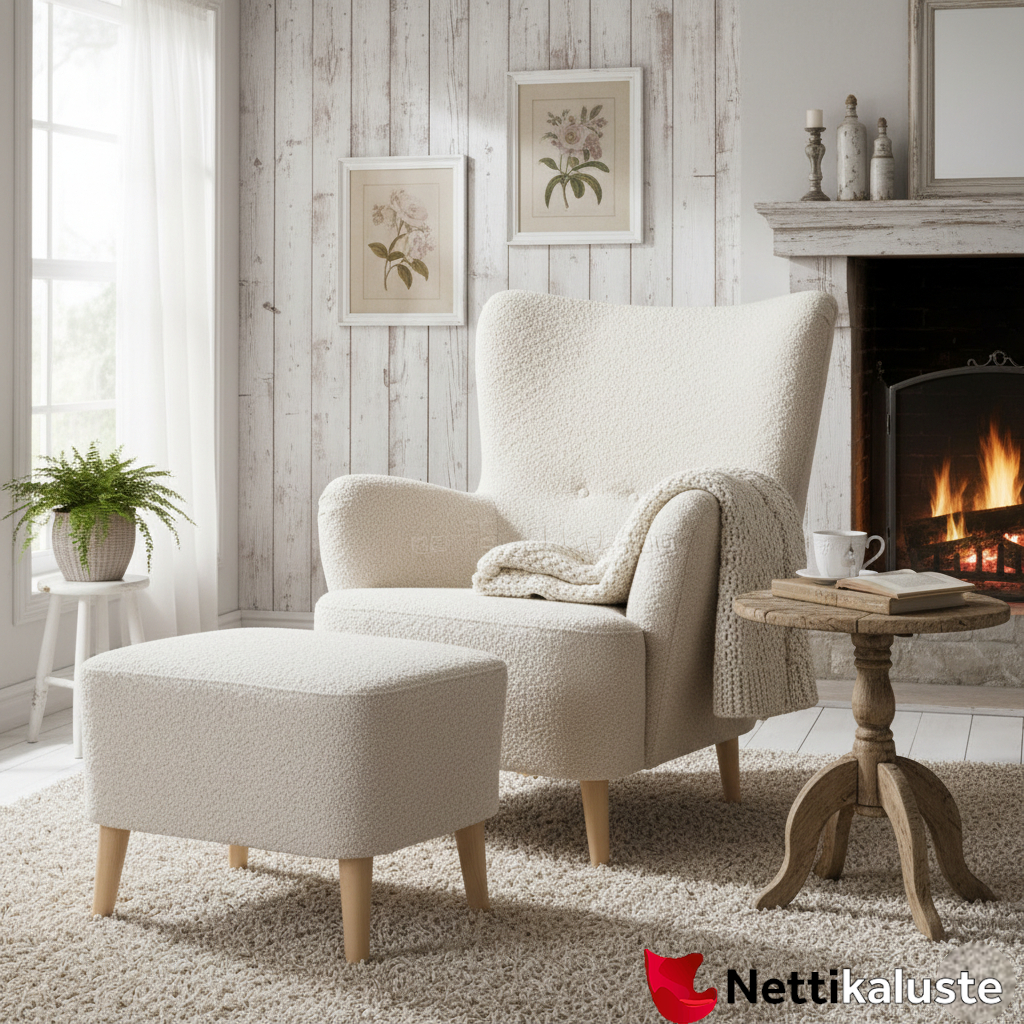 Emilia nojatuoli tuo kotiin pehmeää mukavuutta ja tyylikästä ilmettä. Vaalean pellavansävyinen, pörröisen pehmeä verhoilukangas luo lämpimän ja kutsuvan tunnelman, joka sopii loistavasti skandinaaviseen sisustukseen. Korkea selkänoja tukee hyvin yläselkää ja niskaa, ja kaarevat käsinojat tekevät istuma-asennosta luonnollisen ja ergonomisen. Voit valita tuolin rahilla tai ilman – rahi täydentää kokonaisuuden ja tarjoaa rentouttavan paikan nostaa jalat ylös.