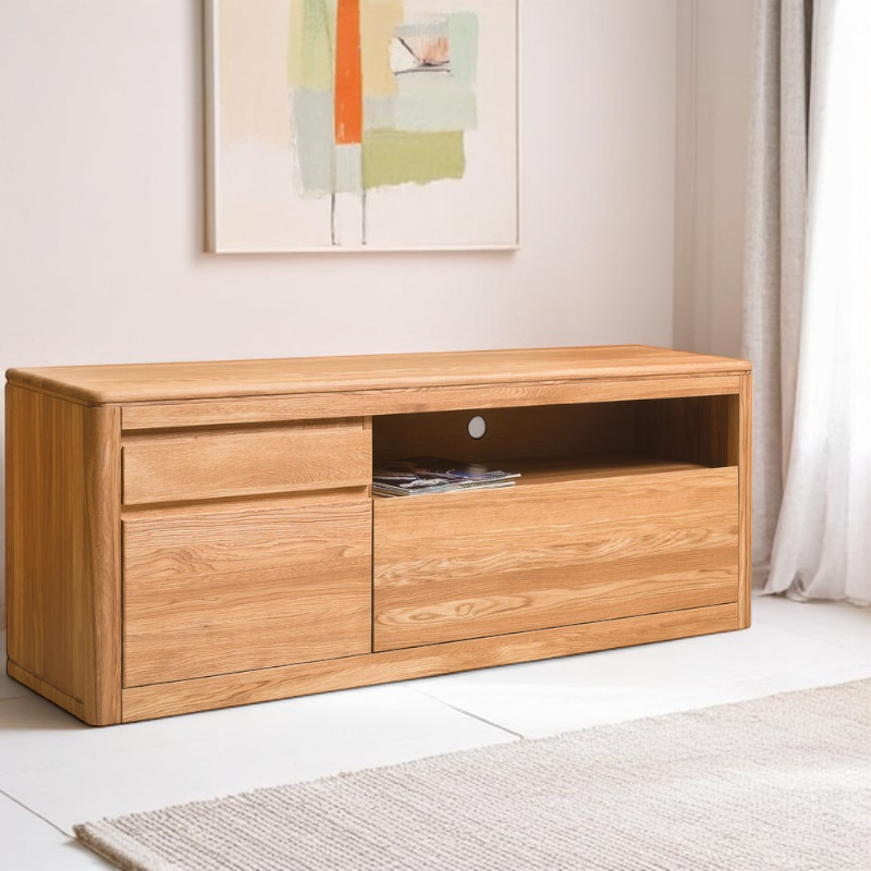 Mindi tuotesarjan TV-taso kahdella ovikaapilla ja avotasolla. TV-taso on valmistettu korkealaatuisesta massiivitammesta. Puun pinta on harjattu, jolloin puun luonnollinen pinta saadaan kauniisti näkyviin.