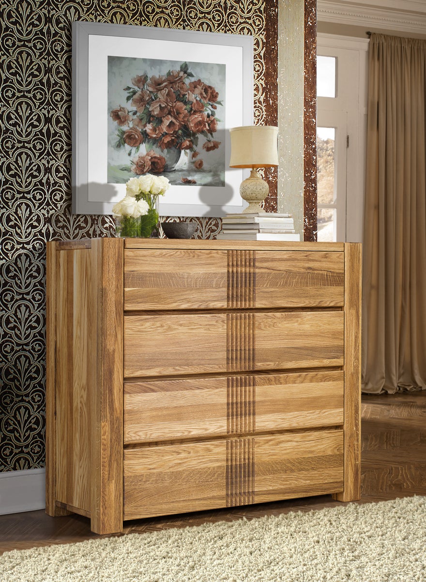 Näyttävä, massiivitammesta valmistettu tukeva lipasto neljällä tilavalla vetolaatikolla. Kauniit sormiurat antavat lipastolle tyylikkään ulkonäön. Laatikoissa on herkästi liukuvat metallikiskot. Lipasto on valmistettu massiivitammesta, jonka pinta on viimeistelty puuöljyllä.
