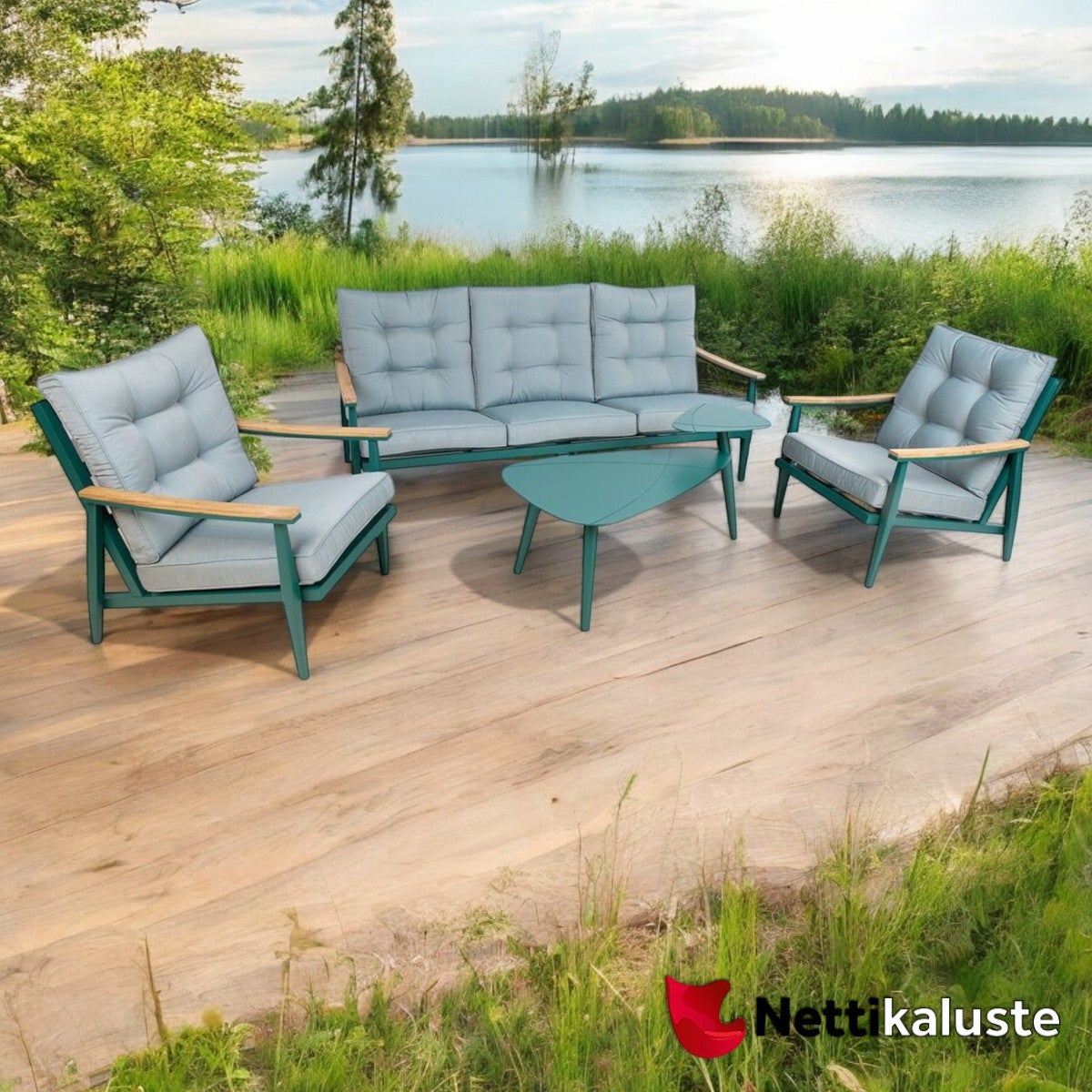 Calvin puutarhakalusto on sinulle joka haet hieman persoonallisempaa puutarhakalustoa. Kalustossa on mielenkiintoisen vihreä värimaailma, 2-tasoinen sohvapöytä ja tiikkipuiset käsinojat. Paksut pehmusteet takaavat erinomaisen istumamukavuuden.