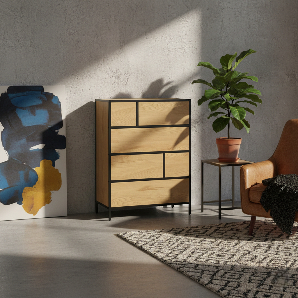 Inari-lipasto hurmaa saarnin luonnollisella kauneudella ja mustan modernilla ilmeellä. Metallirunko takaa kestävyyden ja vakauden, ja sen jauhemaalipinta suojaa pintaa naarmuilta ja ruostumiselta. Laatikot ja sivusarjat on valmistettu kestävästä melamiinilevystä saarnipinnoitejäljitelmällä, joka tuo lämpöä ja luonnollista ilmettä. Inari-lipaston kuusi tilavaa laatikkoa tarjoavat runsaasti säilytystilaa niin olohuoneeseen, eteiseen kuin makuuhuoneeseenkin.