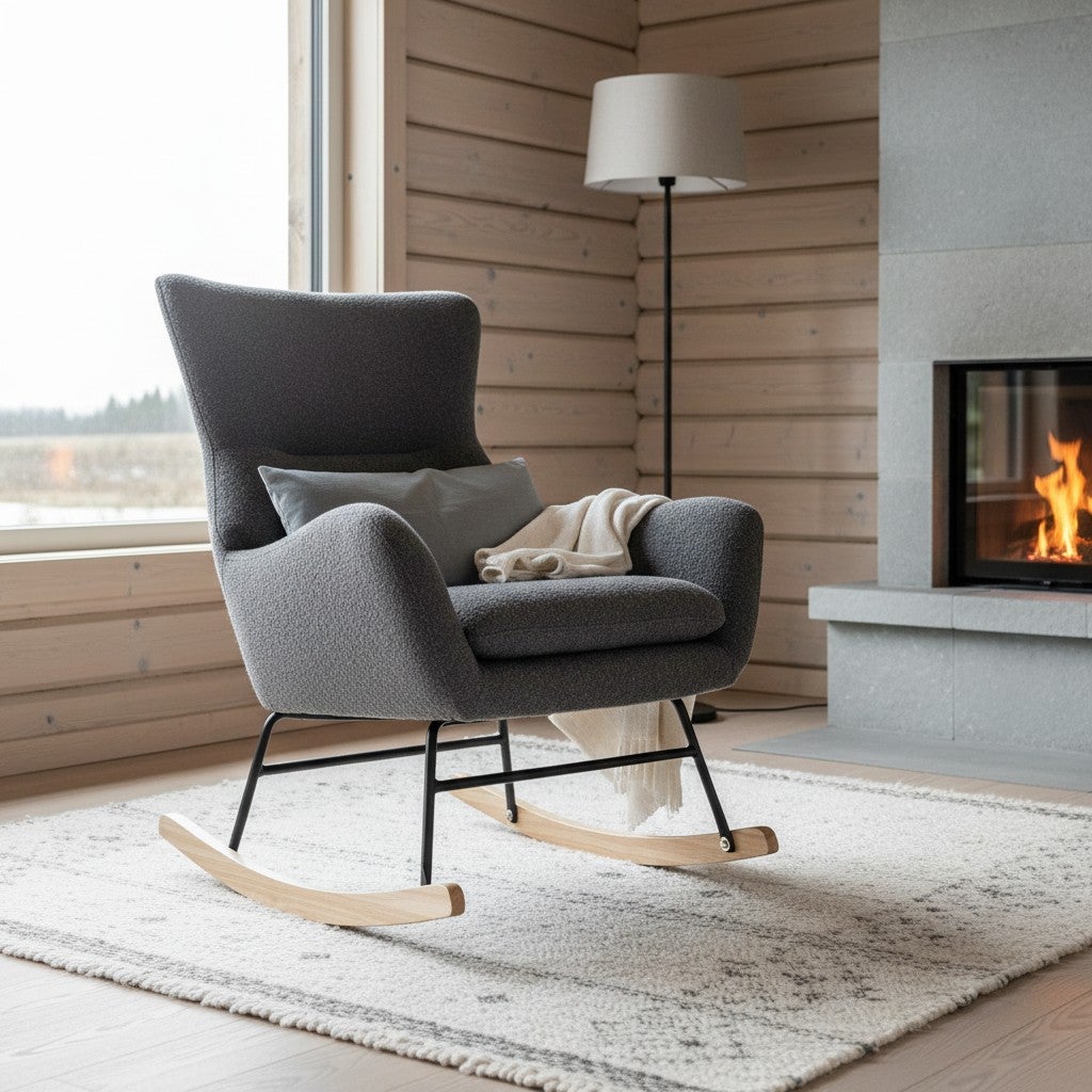 Saima keinutuolissa on tyylikkyys ja mukavuus samassa paketissa. Keinutuoli on verhoiltu ihanan pörröisellä kankaalla, mikä tekee istumisesta erityisen miellyttävää. Istuin on pehmustettu vaahtomuovilla. Keinutuolin jalat ovat mustaksi maalattua metallia sekä puuta. Harmaa kangas on tyylikäs ja varma valinta vuodesta toiseen. Keinuminen hiljalleen on erityisen rentouttavaa ja se tarjoaa tilaisuuden rauhoittua ja nauttia olosta kotisi mukavuudessa. Saima keinutuoli on loistava valinta Suomalaiseen kotiin!