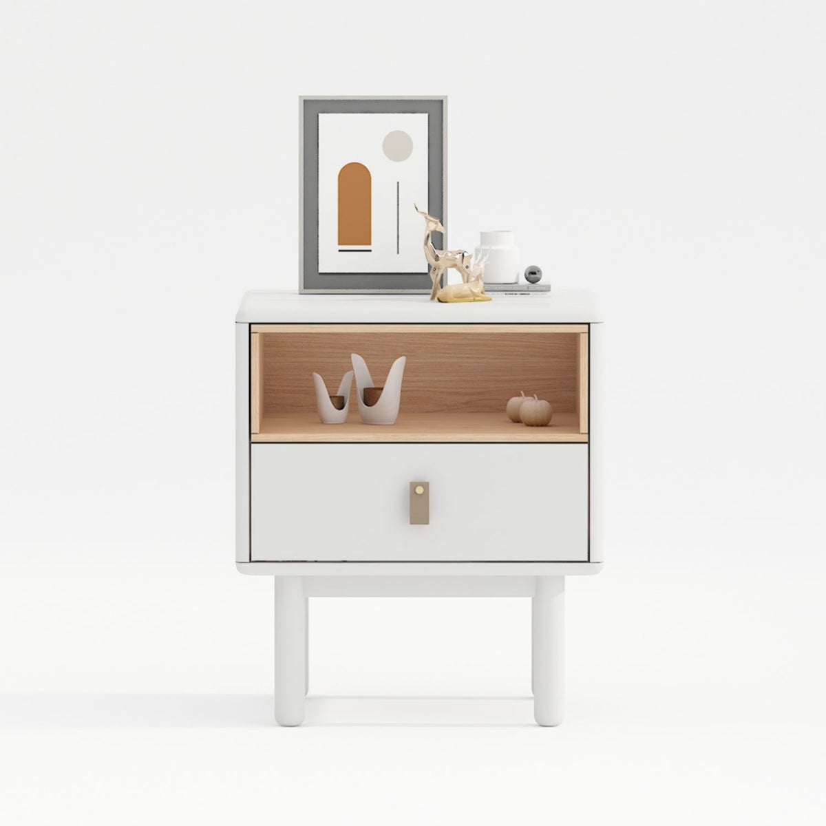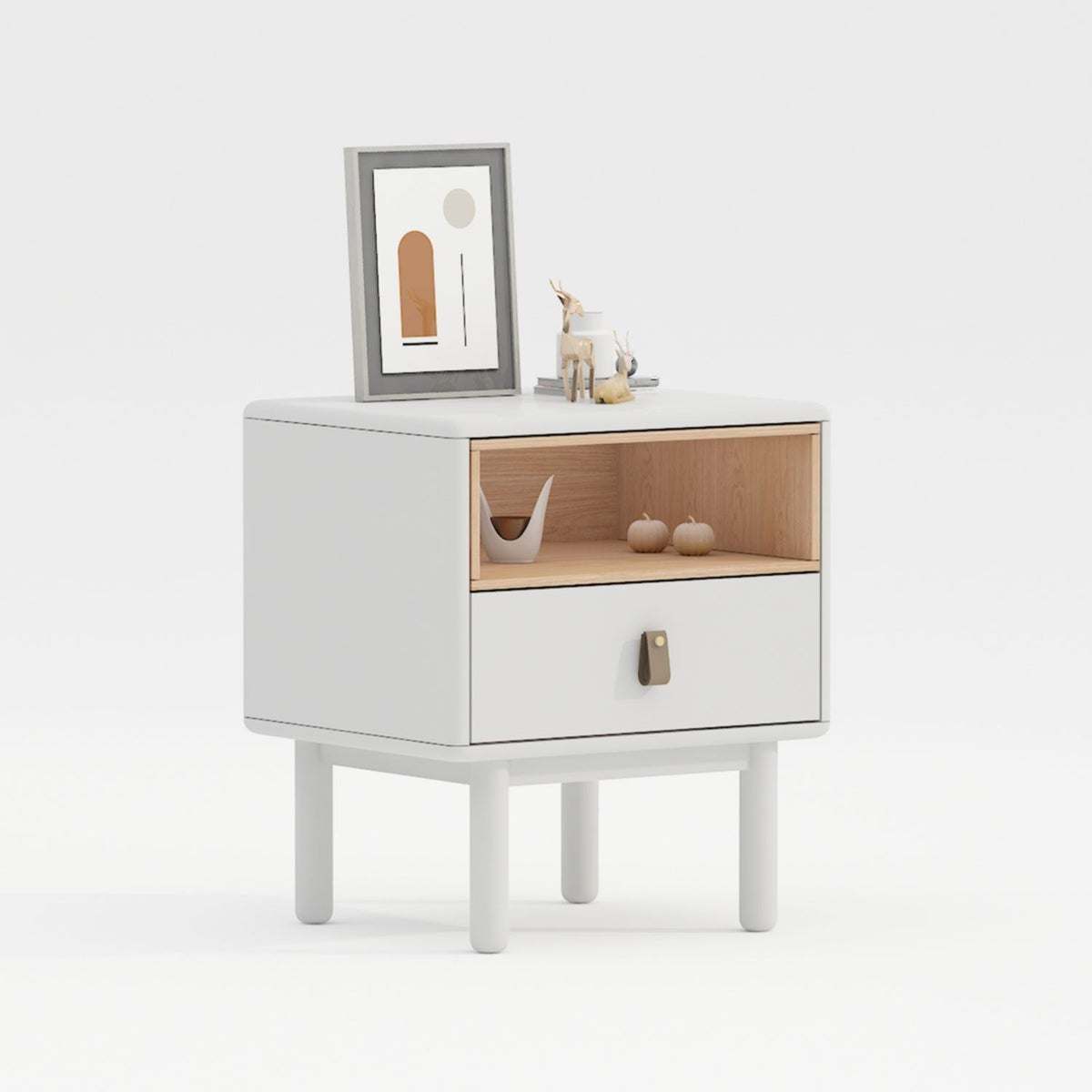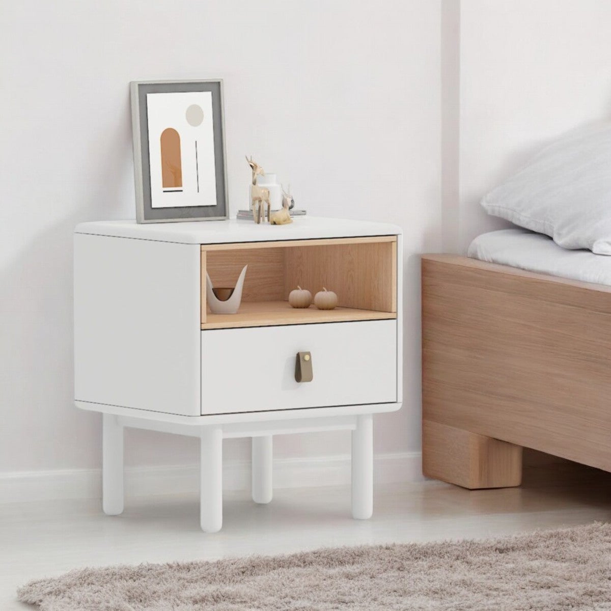 Yöpöytä on valmistettu vahvasta 18mm MDF-levystä ja sen jalat sekä pohjarunko ovat massiivipuuta. Sen ajaton ja elegantti valkoinen väri ja pyöristetyt ulkoreunat tekevät siitä ajattoman lisän kotiisi. Bowe-yöpöytä on viimeistelty kestävällä polyuretaanimaalilla, joka suojaa sitä naarmuilta ja kulumiselta. Vetolaatikossa on tyylikkäät nahkainen kahva ja yläosassa on kaunis puunvärinen avohylly.