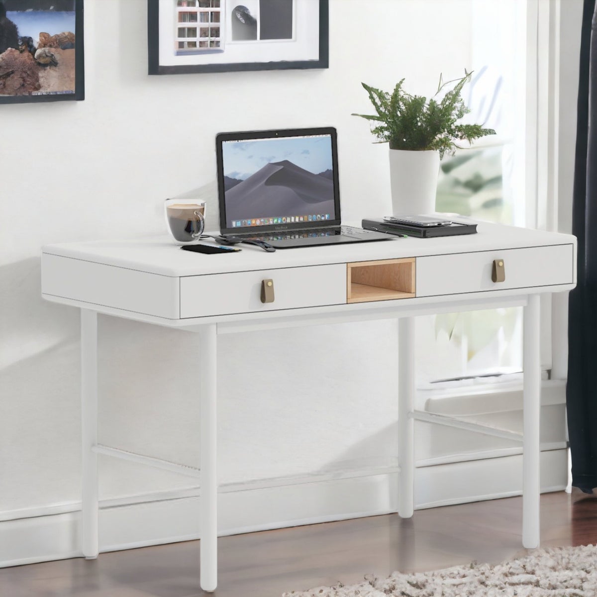 Pöytä on valmistettu vahvasta 18mm MDF-levystä ja sen jalat sekä pohjarunko ovat massiivipuuta. Sen elegantti valkoinen väri ja pyöristetyt ulkoreunat tekevät siitä ajattoman lisän kotiisi. Bowe-kirjoituspöytä on viimeistelty kestävällä polyuretaanimaalilla, joka suojaa sitä naarmuilta ja kulumiselta. Vetolaatikoissa on tyylikkäät nahkaiset kahvat ja keskellä on kaunis puunvärinen avohylly.
