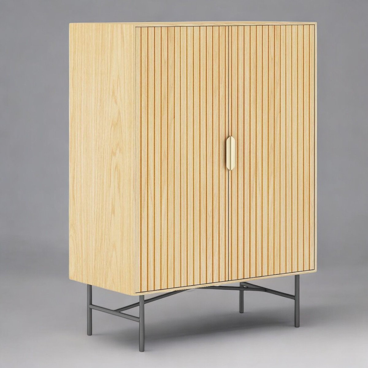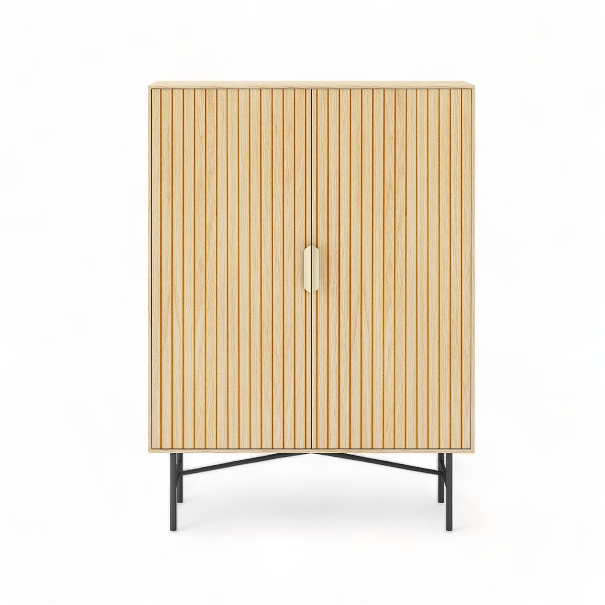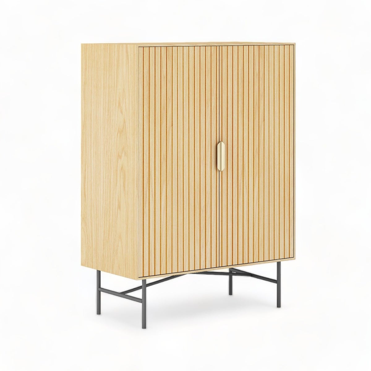 Kaappi on valmistettu kestävästä 3D-melamiinilevystä ja koristeltu hienolla vaalealla puukuviolla, tämä kaappi huokuu ylellisyyttä. Urautetut ovipaneelit ja elegantit kullatut kahvat antavat sille trendikkään ja hienostuneen ilmeen, joka täydentää sisustustasi täydellisesti. Kaapin metalliset jalat ja musta alusta lisäävät vakautta ja kestävyyttä, säilyttäen samalla modernin ja siistin ilmeen. Grove Kaappi ei ole pelkästään tyylikäs vaan myös erittäin käytännöllinen lisäys mihin tahansa tilaan.