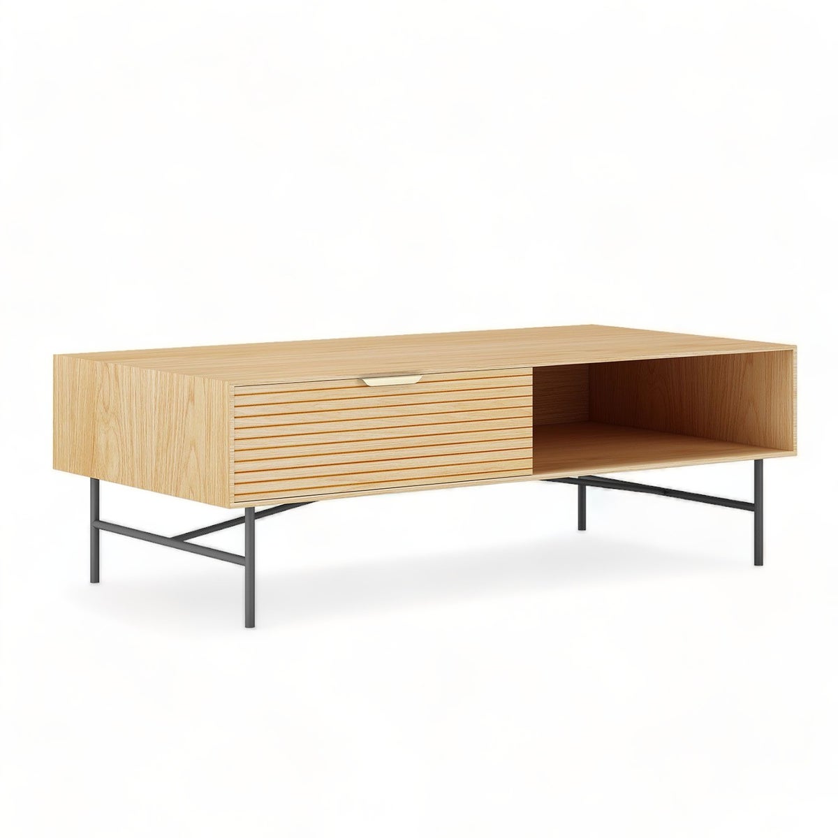 Sohvapöytä suunniteltu olemaan huoneesi keskipiste, joka ihastuttaa modernilla ulkonäöllään. Sen runko on valmistettu kestävästä 3D-melamiinilevystä, joka on koristeltu hienostuneella vaalealla puukuviolla, tuoden mukanaan ylellisen ja laadukkaan ilmeen. Urautetut paneelit ja tyylikäs kullattu kahva lisäävät pöydälle trendikkään ja houkuttelevan ulkonäön, joka täydentää sisustustasi upeasti. Pöydän metalliset jalat ja alusta on päällystetty mustalla jauhemaalauksella, mikä vahvistaa sen vakautta ja kestävyyttä, säilyttäen samalla modernin ja siistin ilmeen.