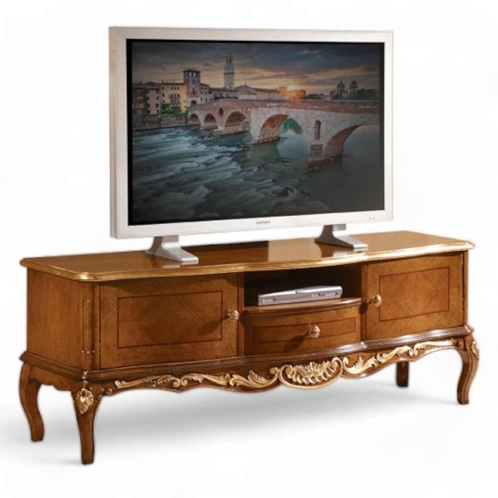 Italialaista laatutyötä edustava Francesca TV-taso on tyylikäs ja veistoksellinen huonekalu, joka hurmaa syvällä koristelulla ja hienolla hopeoinnilla. Kauniisti muotoiltu reuna ja jalkojen kaareva muoto lisäävät sen ilmavuutta ja kauneutta. Tason kaksi kaappia ja avotaso tarjoavat käytännöllistä säilytystilaa. Francesca TV-taso toimitetaan valmiiksi kasattuna ja on saatavilla myös ilman hopeointia. Tuo kotiisi italialaista tyyliä ja laatua. Taso on valmistettu pyökkipuusta ja Mdf-levystä.