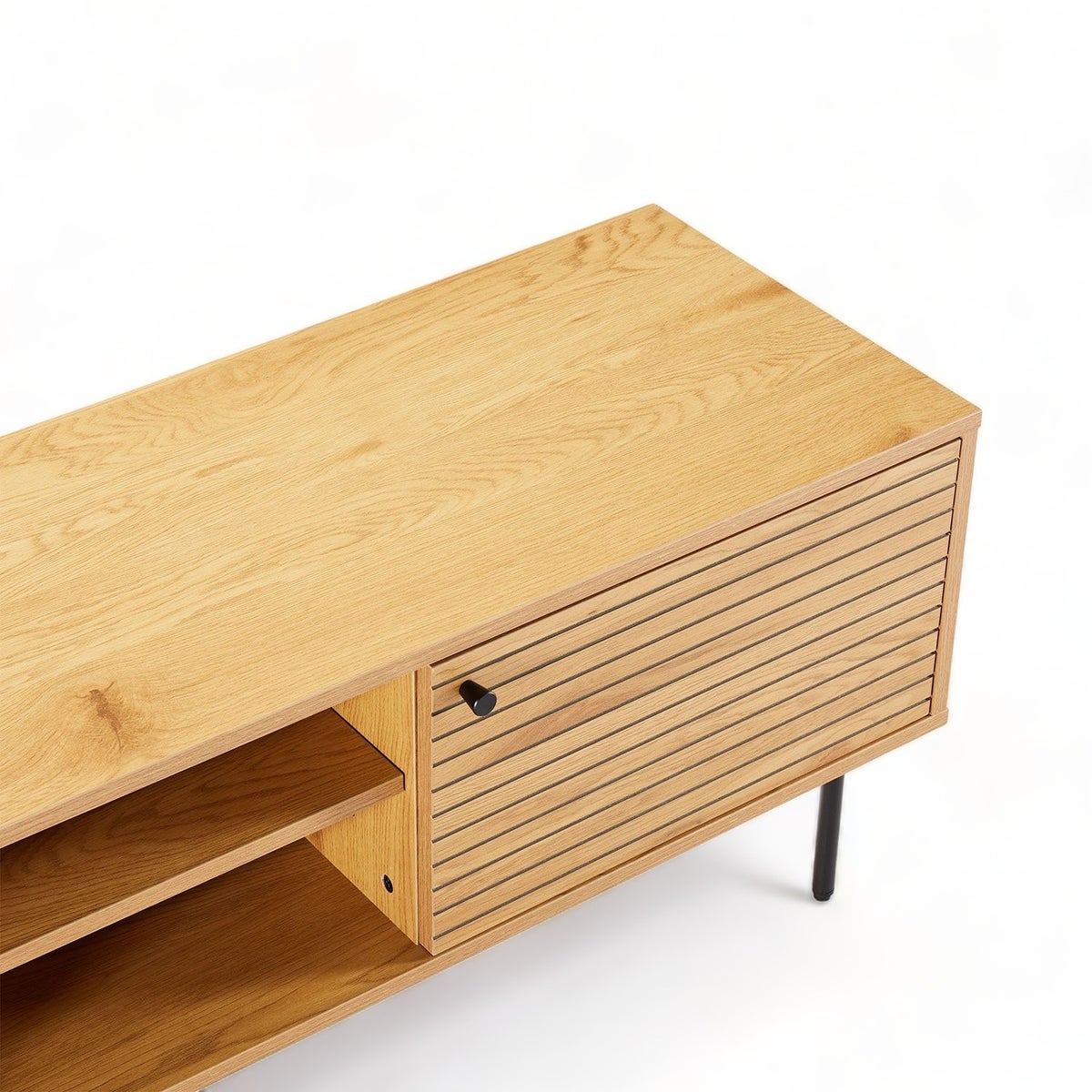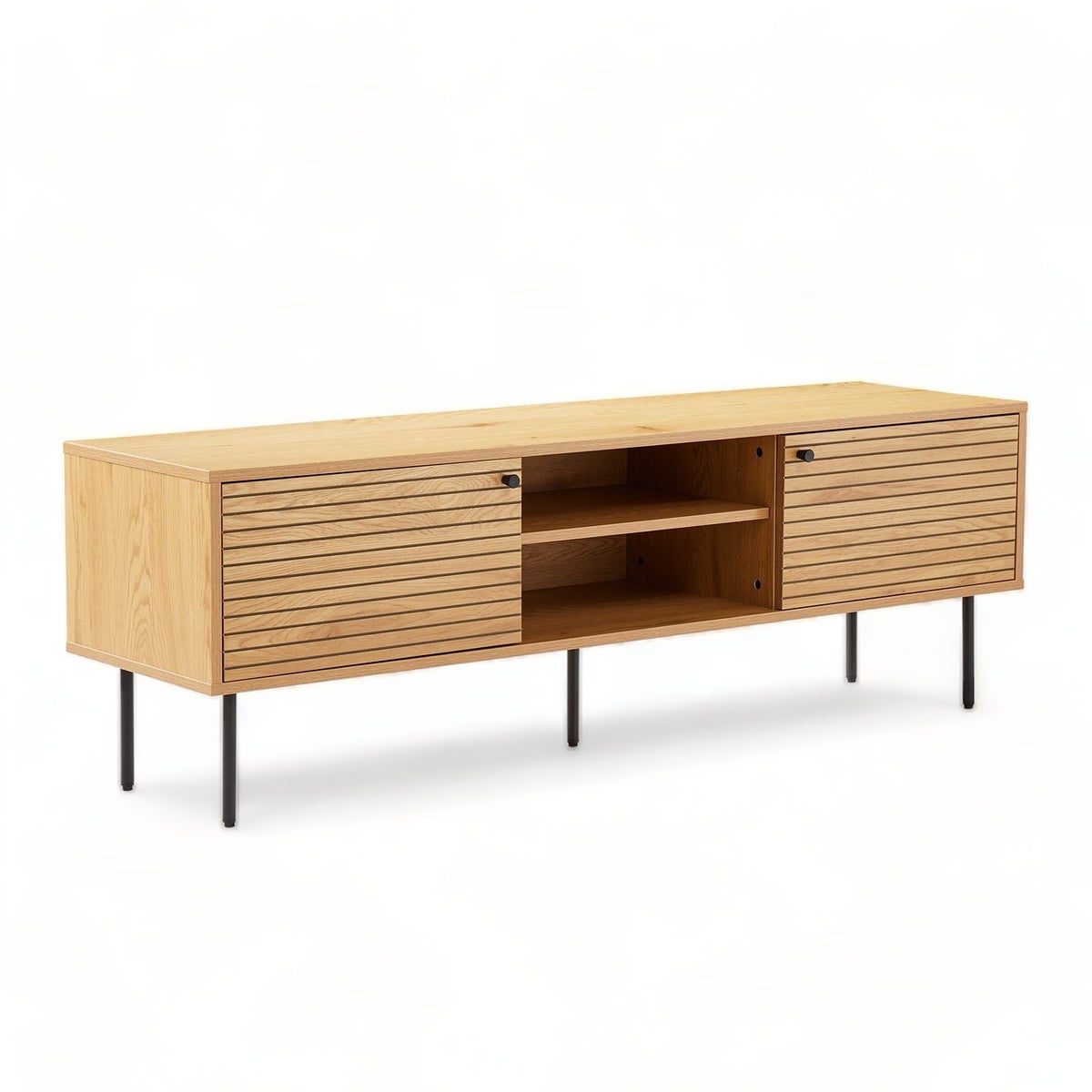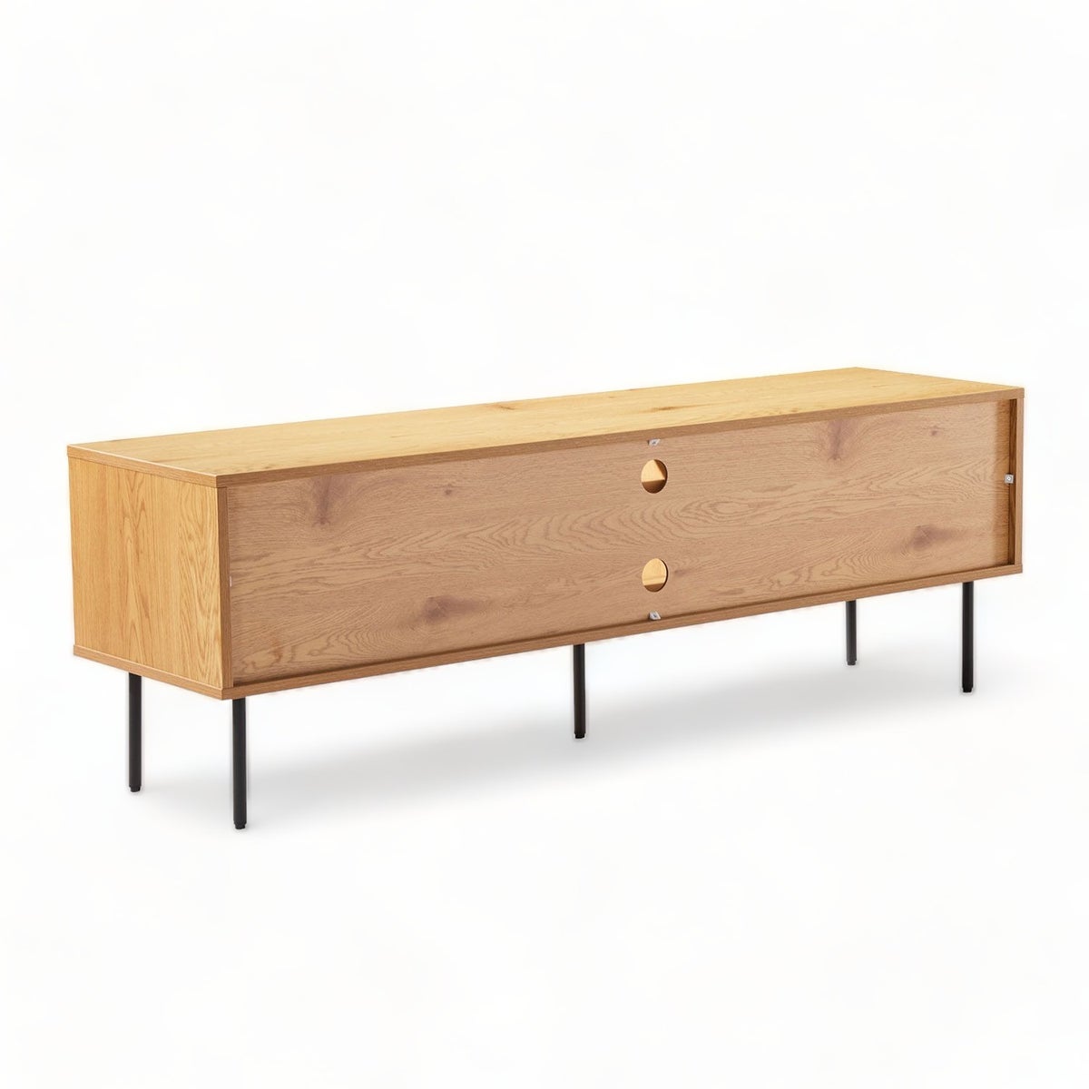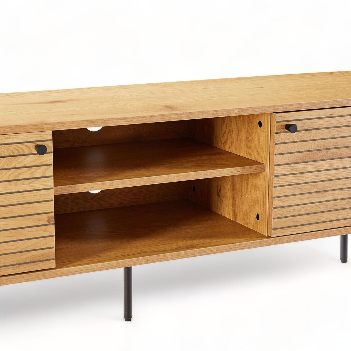 150 cm leveä Craft tv-taso sisältää kaksi ovikaappia välihyllyillä sekä tilavan avotason esimerkiksi kodin viihdelaitteille. Elegantti tammikuviointi yhdessä raidallisten MDF-etulevyjen ja kohokuviopinnan kanssa tekevät siitä persoonallisen katseenvangitsijan. Tv-tason hienostunut koristelu kapeilla tammenvärisillä listoilla täydentää tyylikkyyttä. Mustilla jauhemaalatuilla metallijaloilla luodaan moderni ja tyylikäs vaikutelma.