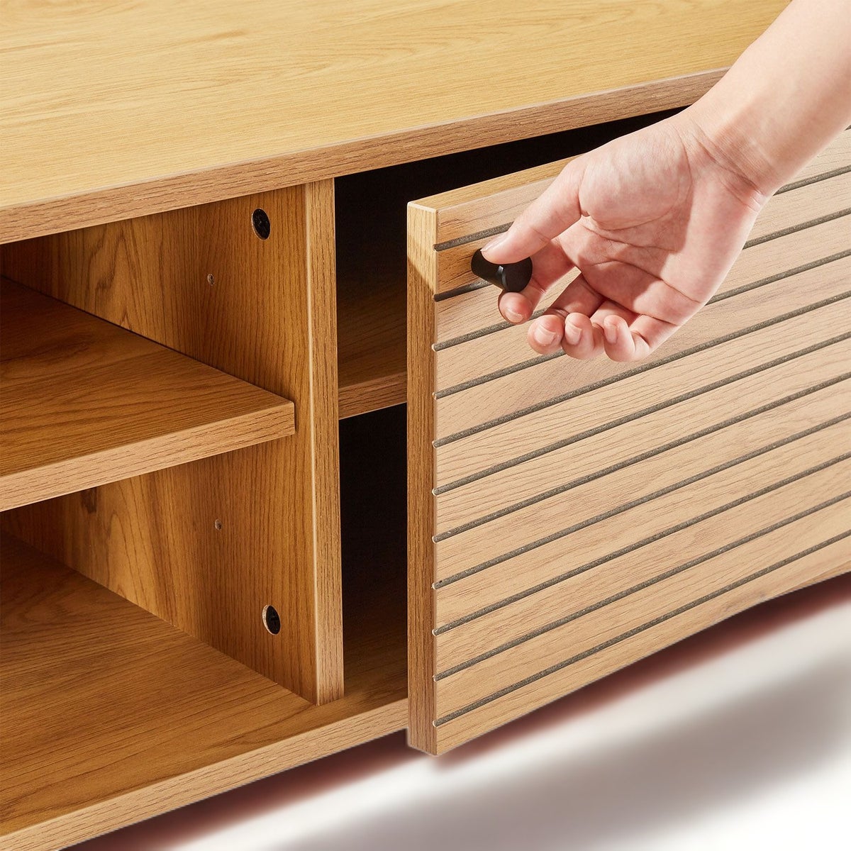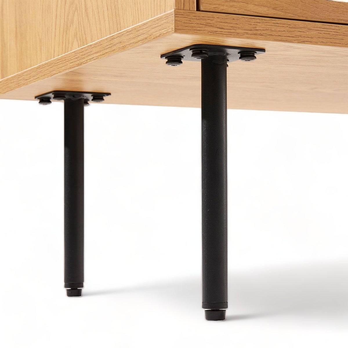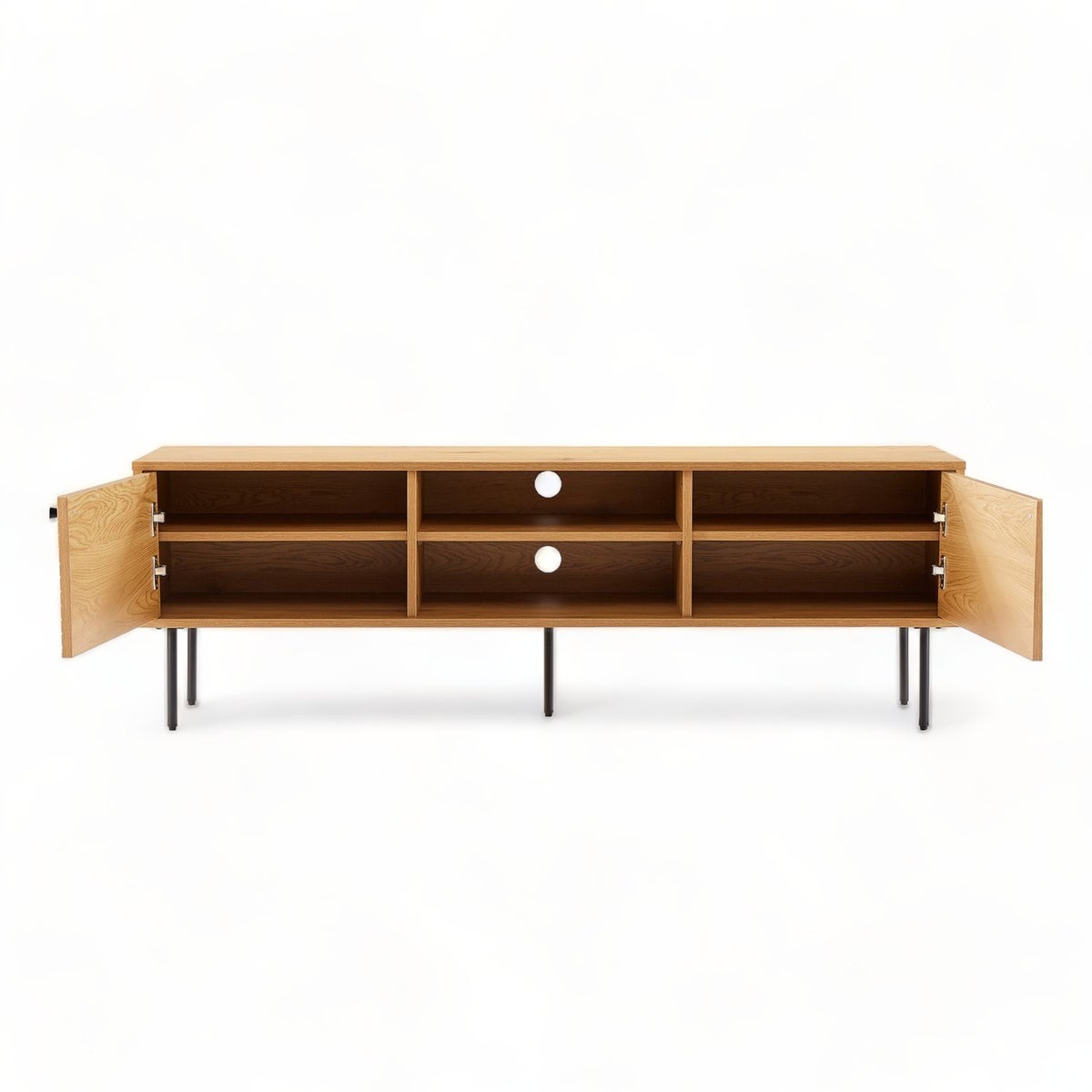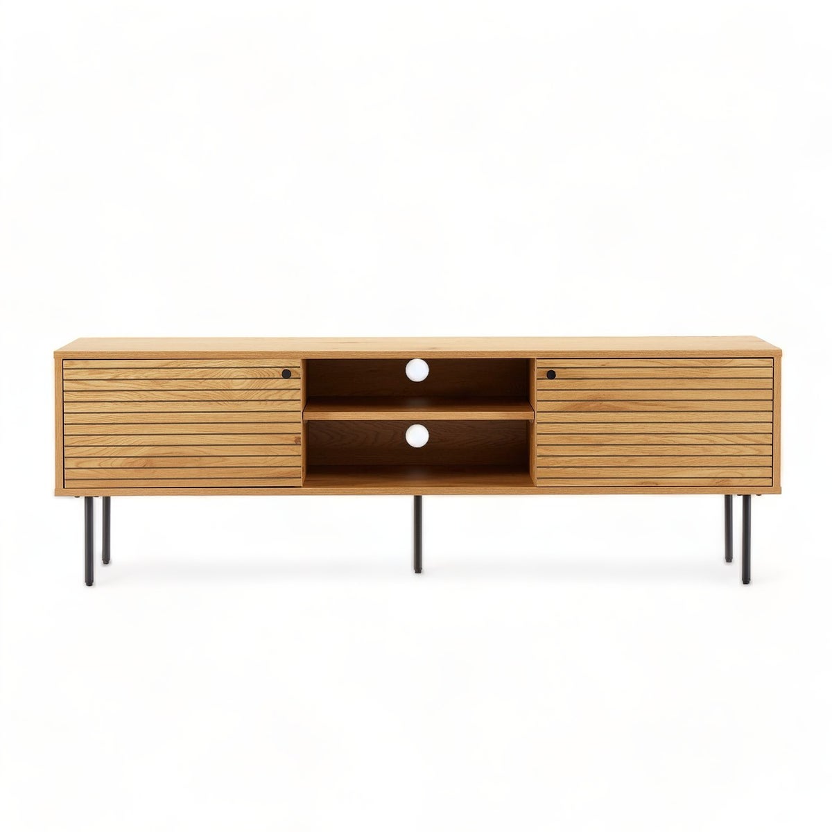 150 cm leveä Craft tv-taso sisältää kaksi ovikaappia välihyllyillä sekä tilavan avotason esimerkiksi kodin viihdelaitteille. Elegantti tammikuviointi yhdessä raidallisten MDF-etulevyjen ja kohokuviopinnan kanssa tekevät siitä persoonallisen katseenvangitsijan. Tv-tason hienostunut koristelu kapeilla tammenvärisillä listoilla täydentää tyylikkyyttä. Mustilla jauhemaalatuilla metallijaloilla luodaan moderni ja tyylikäs vaikutelma.
