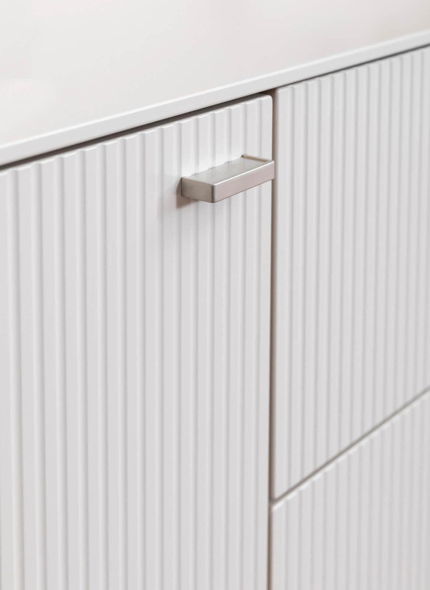 Skandinaavinen design: Selkeä muotoilu, urakuvioidut ovet ja rauhallinen greige sävy.
