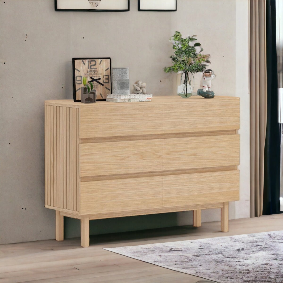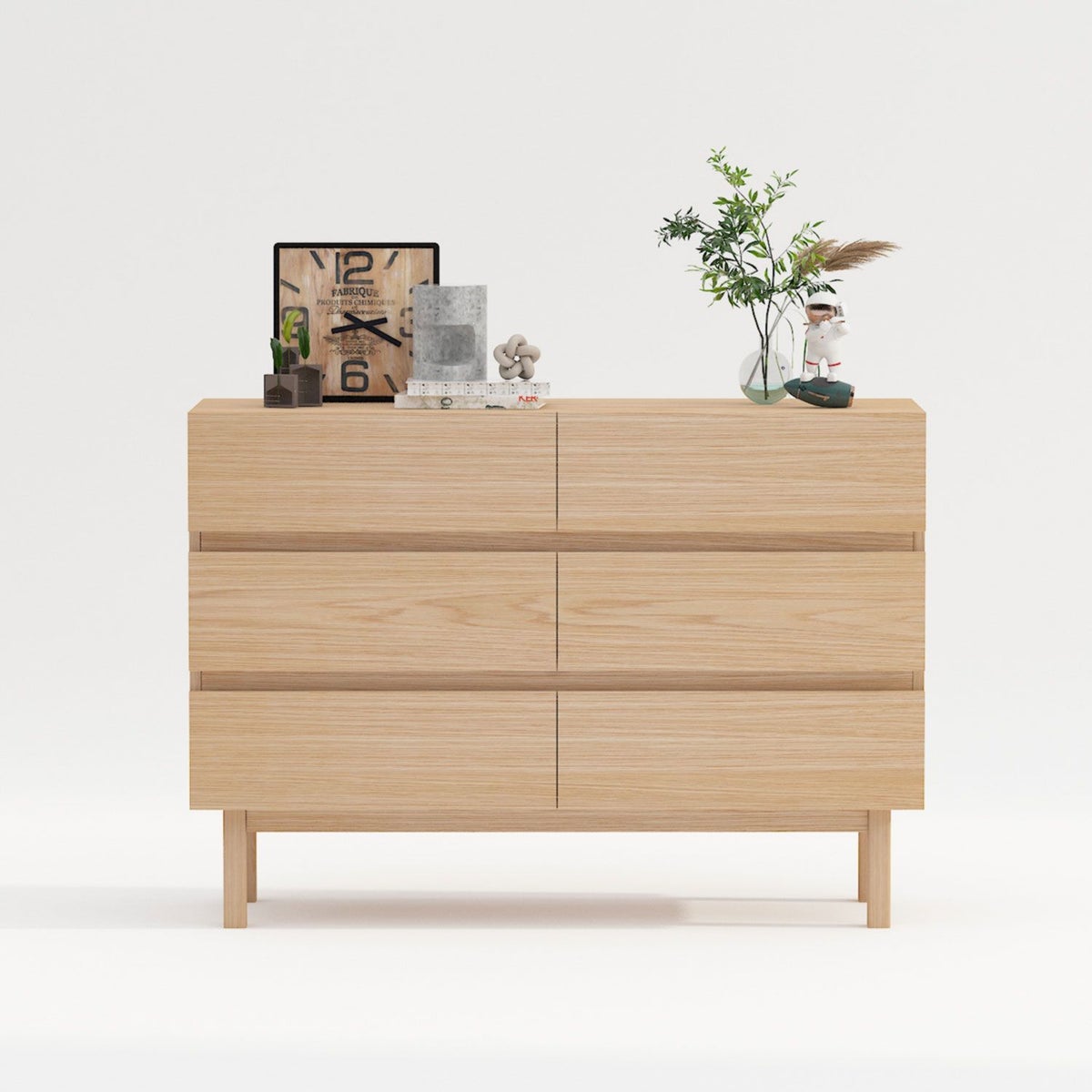 Laatikoston kuusi tilavaa vetolaatikkoa tarjoavat runsaasti säilytystilaa erilaisille esineille ja tarvikkeille. Metalliset liukukiskot takaavat sujuvan ja äänettömän toiminnan jokaisessa laatikossa, tehdäkseen käytöstä helppoa ja miellyttävää. Balmy laatikosto on valmistettu kestävästä melamiinilevystä ja varustettu aidoilla massiivitammijaloilla. Vaalea tammiviilutus pinnassa antaa sille modernin ja raikkaan ilmeen, joka sulautuu saumattomasti erilaisiin sisustustyyleihin.