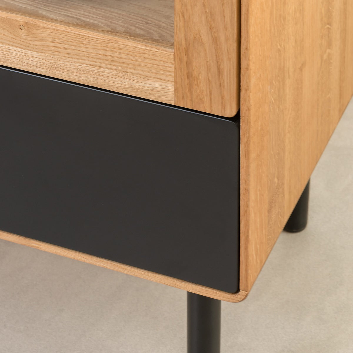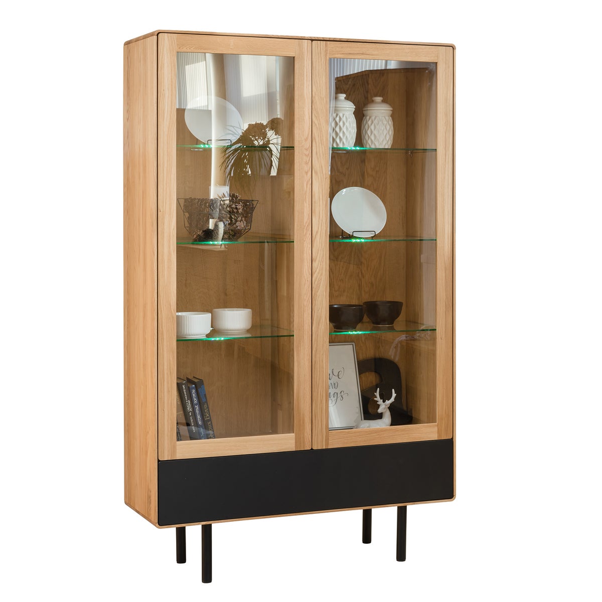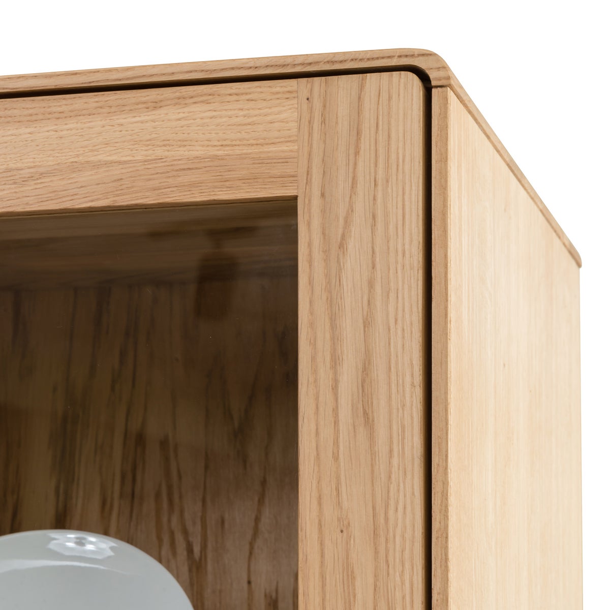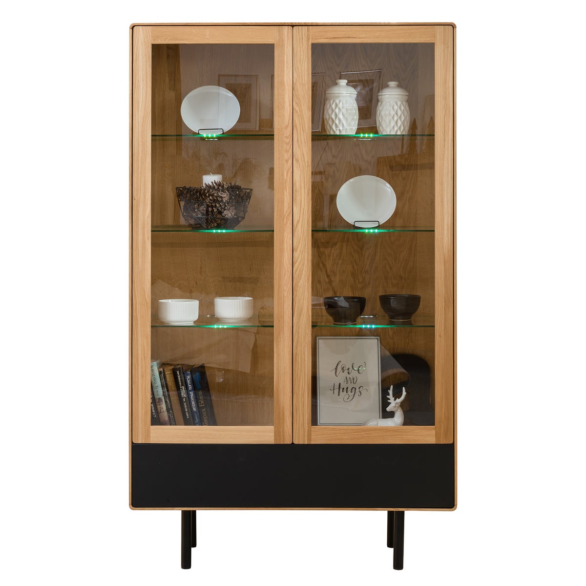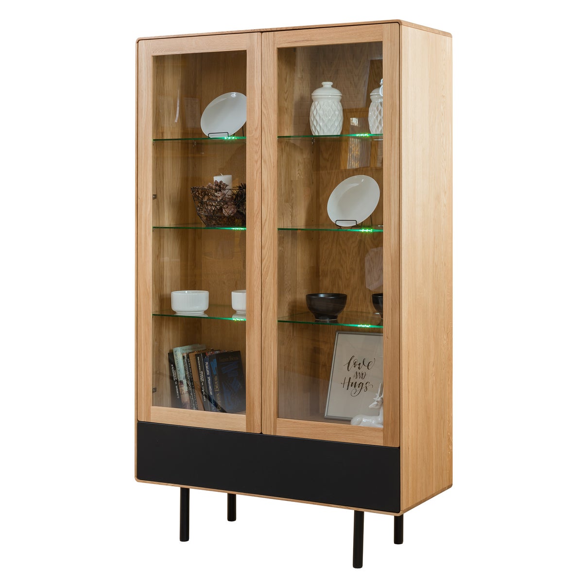 Elegantti Kioto vitriini on valmistettu kestävästä ja laadukkaasta massiivitammesta. Luonnollinen massiivitammi luo tilaan lämpöä ja ajatonta kauneutta. Vitriinissä on upeat ovet suurilla ikkunoilla sekä leveä vetolaatikko. Vetolaatikon etureuna on tyylikästä mustaa mdf-levyä. Vitriinin hyllyt ovat lasia, jotka antavat vitriinille ilmavan ilmeen.