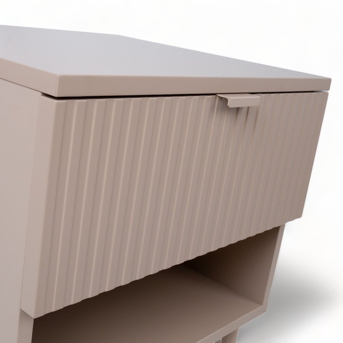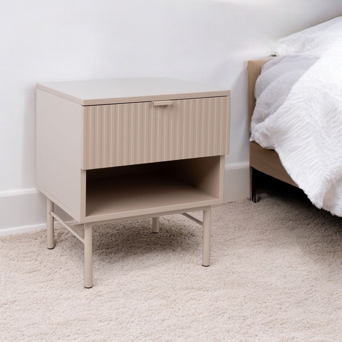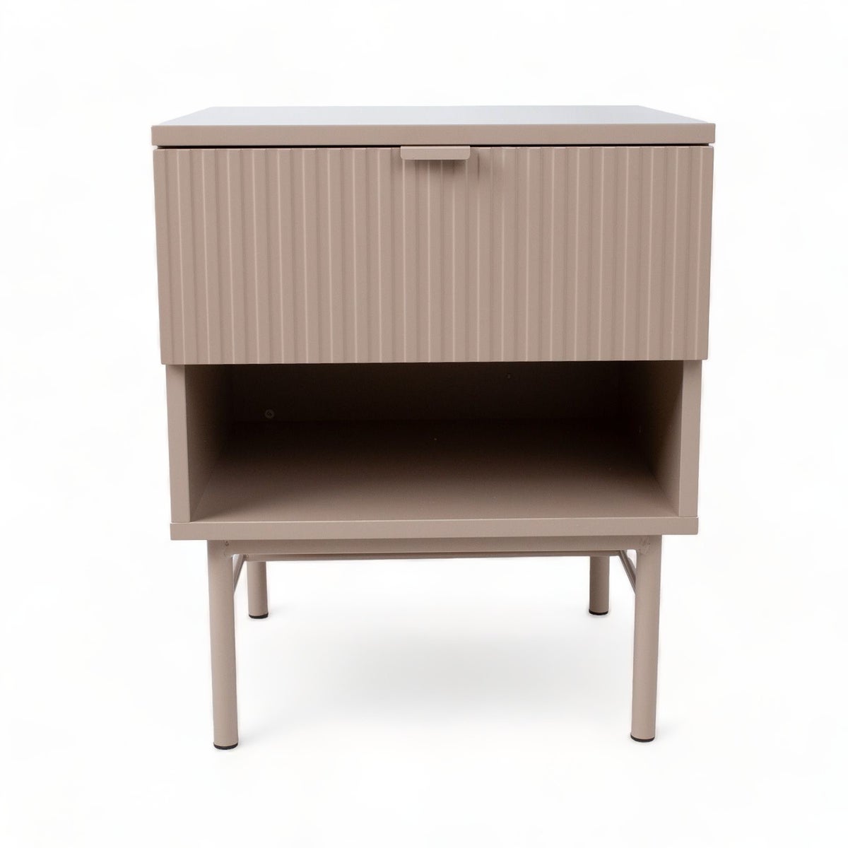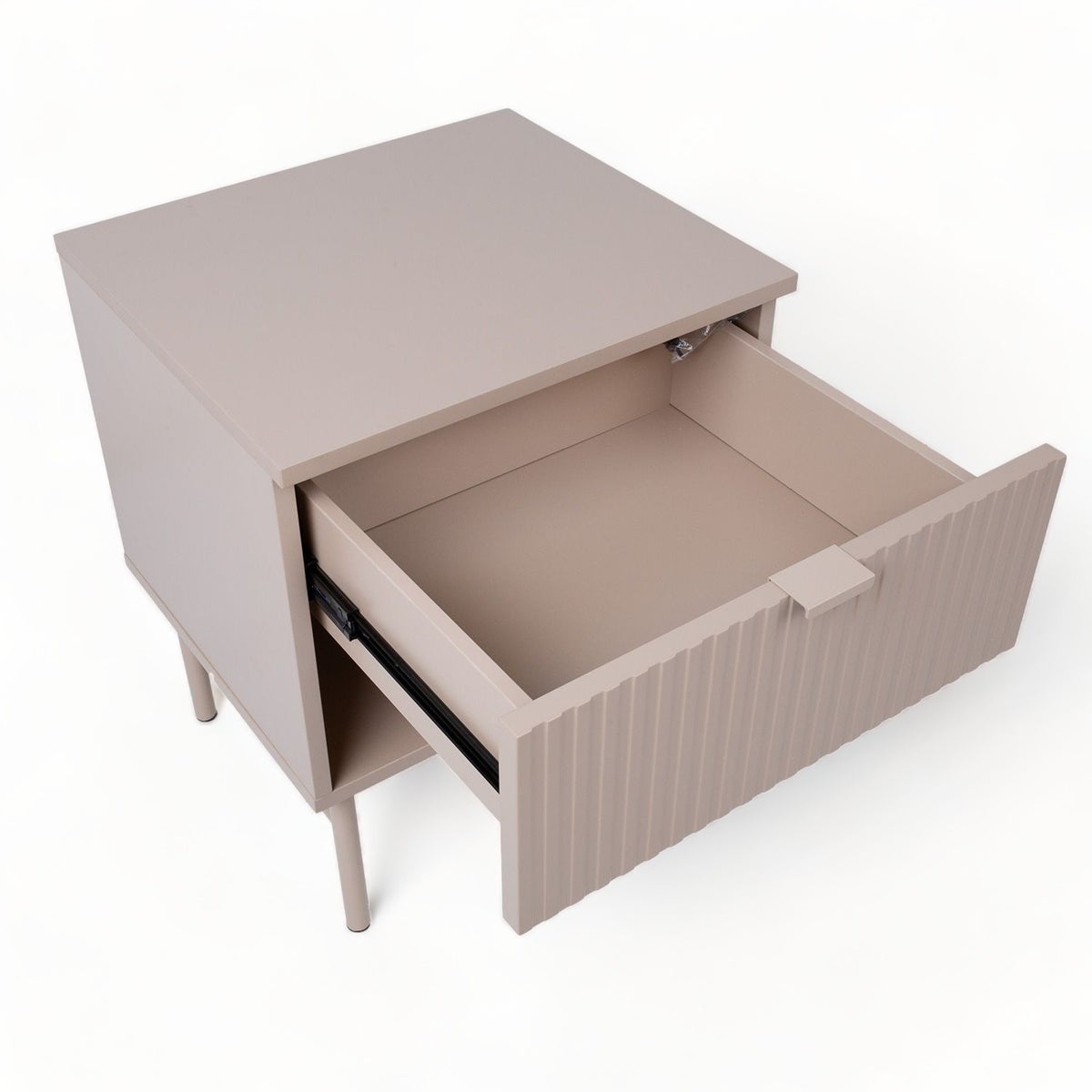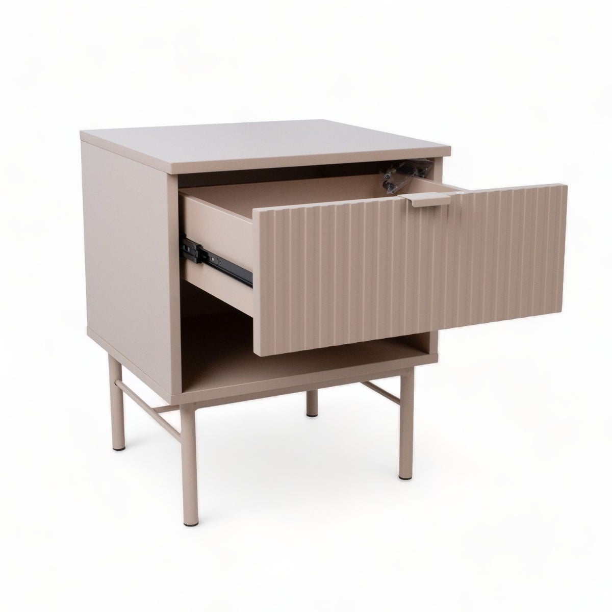Runko-osa on valmistettu kestävästä huonekalulevystä, mikä takaa pitkäikäisen käytön. Vetolaatikon edut korostuvat koristeellisessa uritetussa MDF-paneelissa, joka lisää pöydän visuaalista vetovoimaa. Pöydän jalat on valmistettu kestävästä metallista, mikä takaa vakauden ja luotettavuuden. Lisäksi runko on viimeistelty kestävällä polyuretaanimaalilla, ja jalat on pulverimaalattu, mikä antaa yöpöydälle viimeistellyn ja modernin ilmeen. Hillityn tyylikäs vedin on metallia.