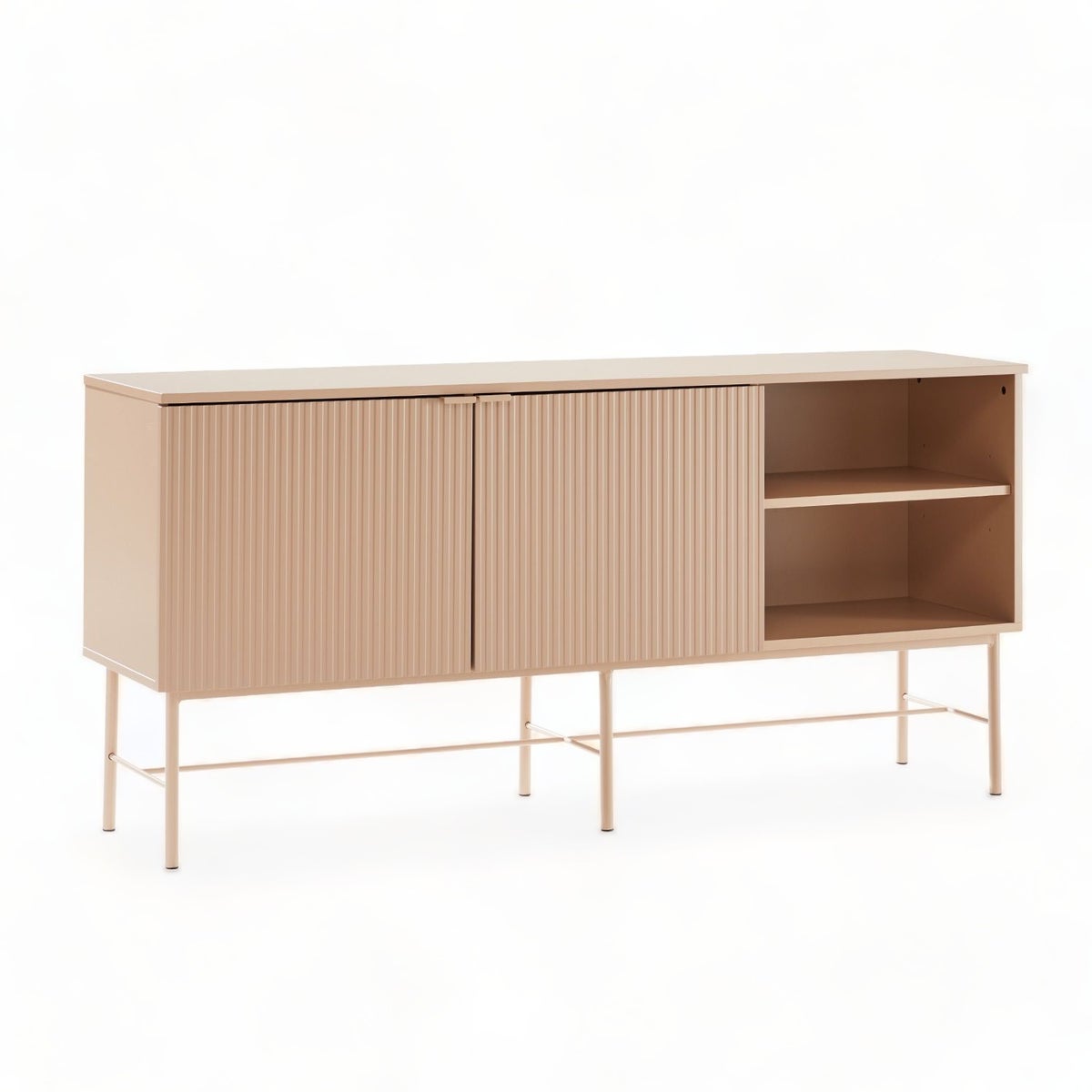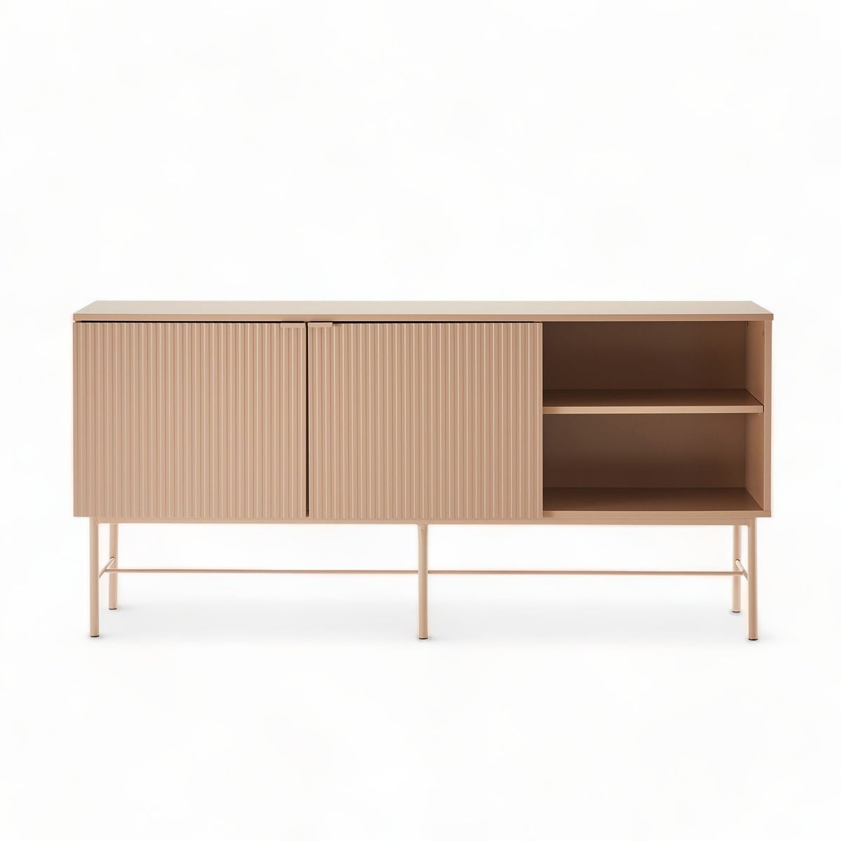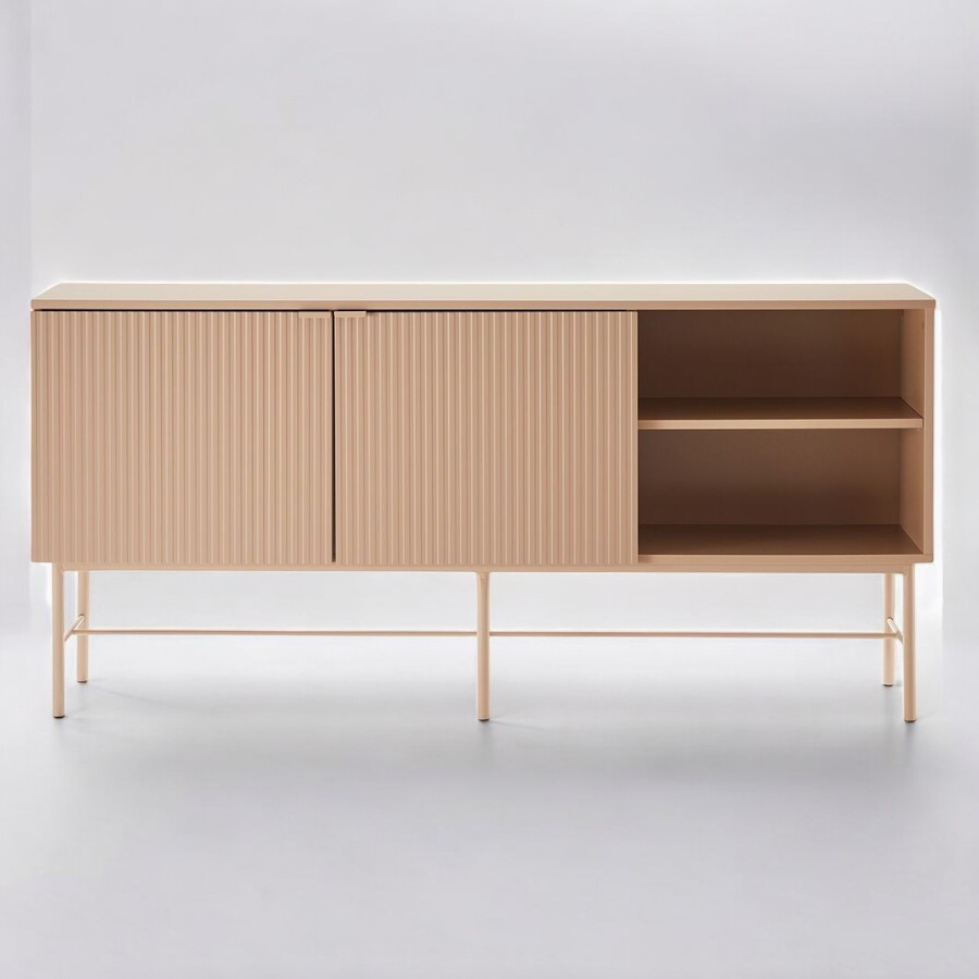 Sen runko on valmistettu kestävästä huonekalulevystä, takaen pitkäikäisen käytön. Sen kaksi umpiovikaappia välihyllyillä ja avohylly tarjoavat käytännöllistä säilytystilaa. Ovien koristeellinen uritettu MDF-paneeli korostaa niiden hienostunutta ilmettä. Jalat, valmistettu kestävästä metallista, tuovat senkkiin vakautta ja luotettavuutta. Runko on viimeistelty kestävällä polyuretaanimaalilla ja jalat on pulverimaalattu, luoden senkille viimeistellyn ja modernin ulkonäön. Metalliset hillityn tyylikkäät vetimet täydentävät sen ilmettä.