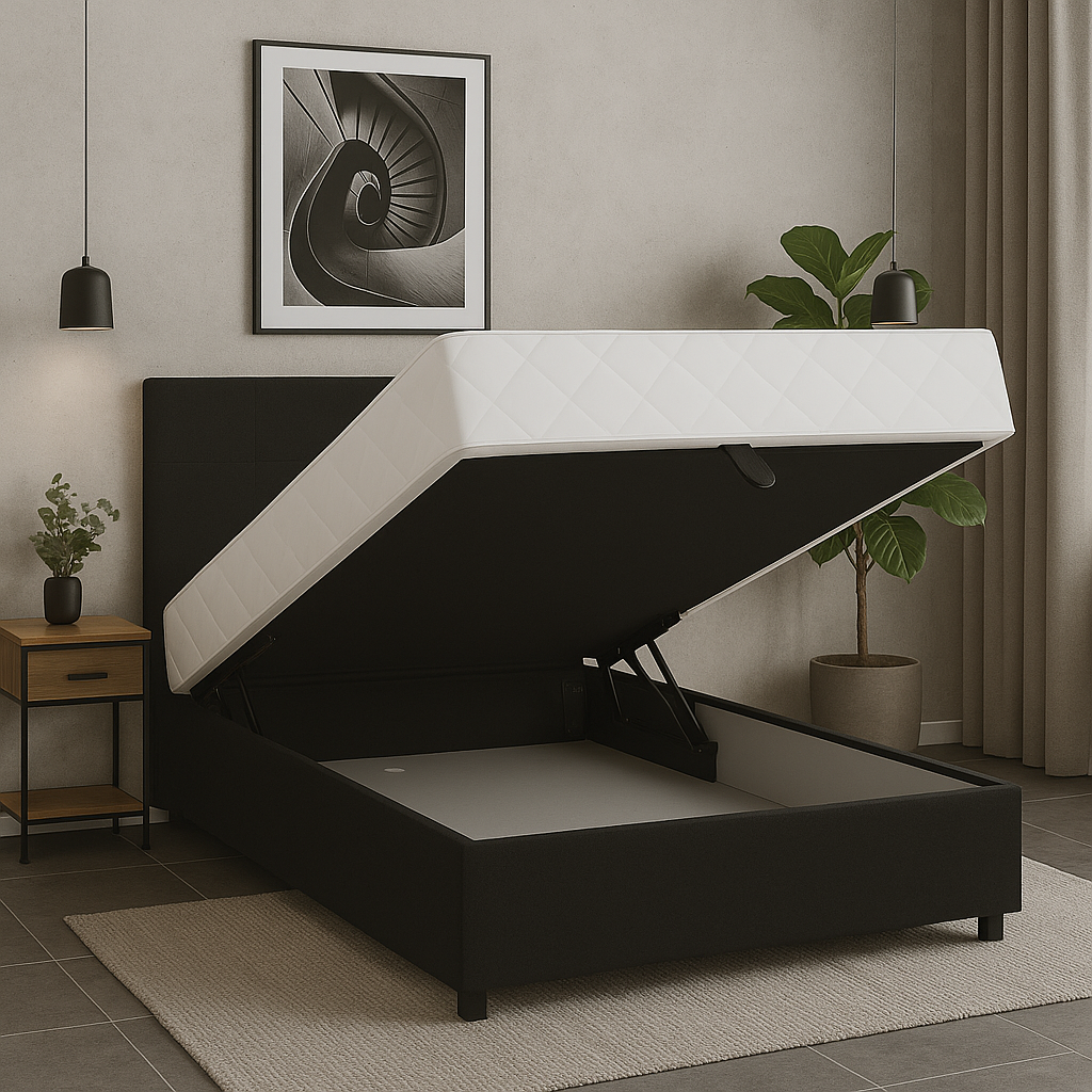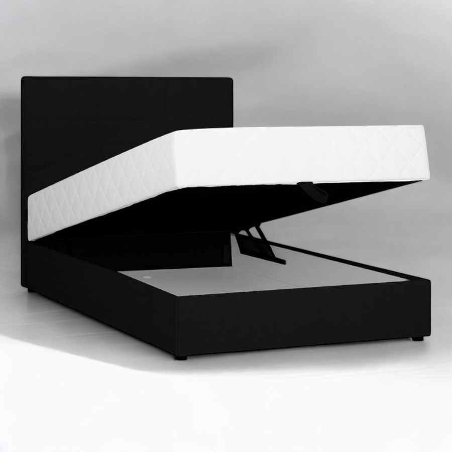 Sängyn alla oleva säilytyslaatikko tuo lisää säilytystilaa vuodevaatteille ja tekstiileille. Mukana tuleva verhoiltu sängynpääty tarjoaa tukevan selkätuen ja viimeistelee kokonaisuuden. Musta verhoilu tekee sängystä ajattoman ja helposti yhdisteltävän eri sisustustyyleihin.