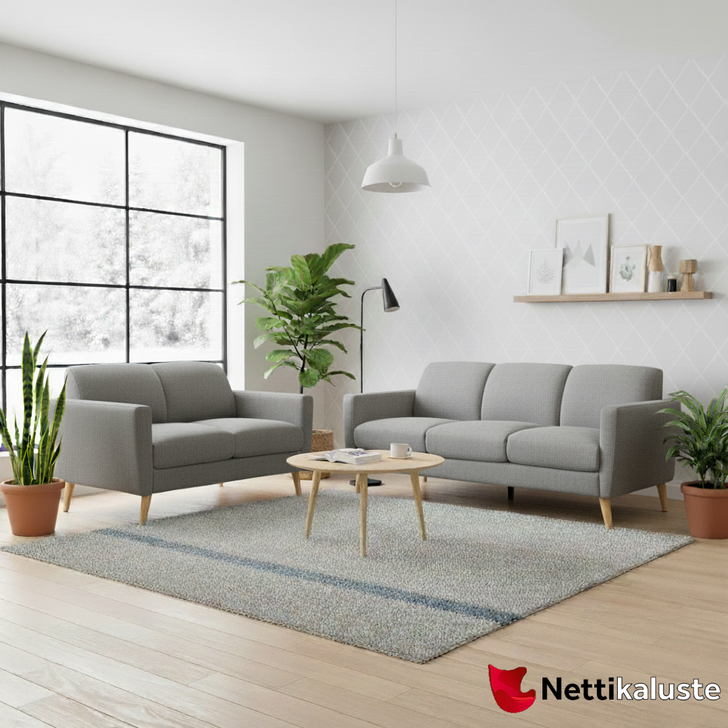 Eva-sohvakalusto luo olohuoneeseen valoisan ja kutsuvan tunnelman, jossa on helppo viihtyä päivän päätteeksi. Vaalean harmaa verhoilu tuo sisustukseen raikkautta ja selkeyttä, ja sen ajaton sävy sopii kauniisti niin skandinaaviseen kuin moderniinkin kotiin. Pehmeä istuinmukavuus ja kevyt muotokieli tekevät kokonaisuudesta rennon ja helposti lähestyttävän.