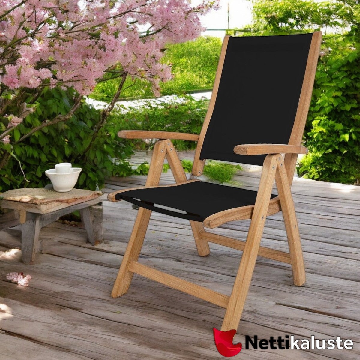 Tuolin synteettinen pinnoite tarjoaa erinomaista sään- ja UV-kestävyyttä sekä helppoa puhdistettavuutta. Lisäksi tuolin selkänojan säätäminen on vaivatonta: nostat vain käsinojia, valitset haluamasi selkänojan asennon ja lukitset käsinojat paikoilleen. Voit valita kuudesta eri asennosta sopivan mukavuuden takaamiseksi.