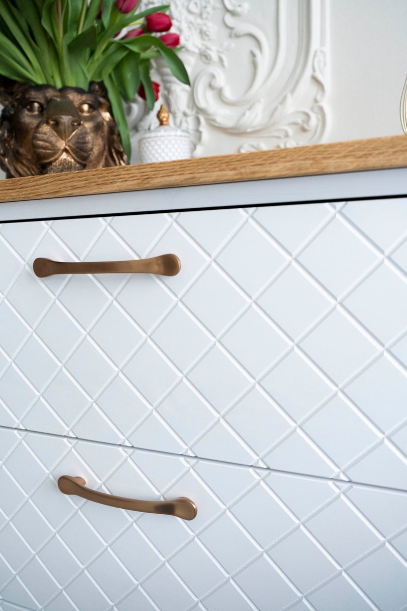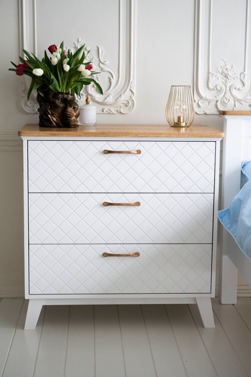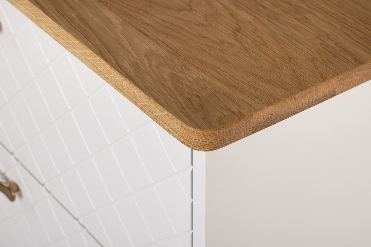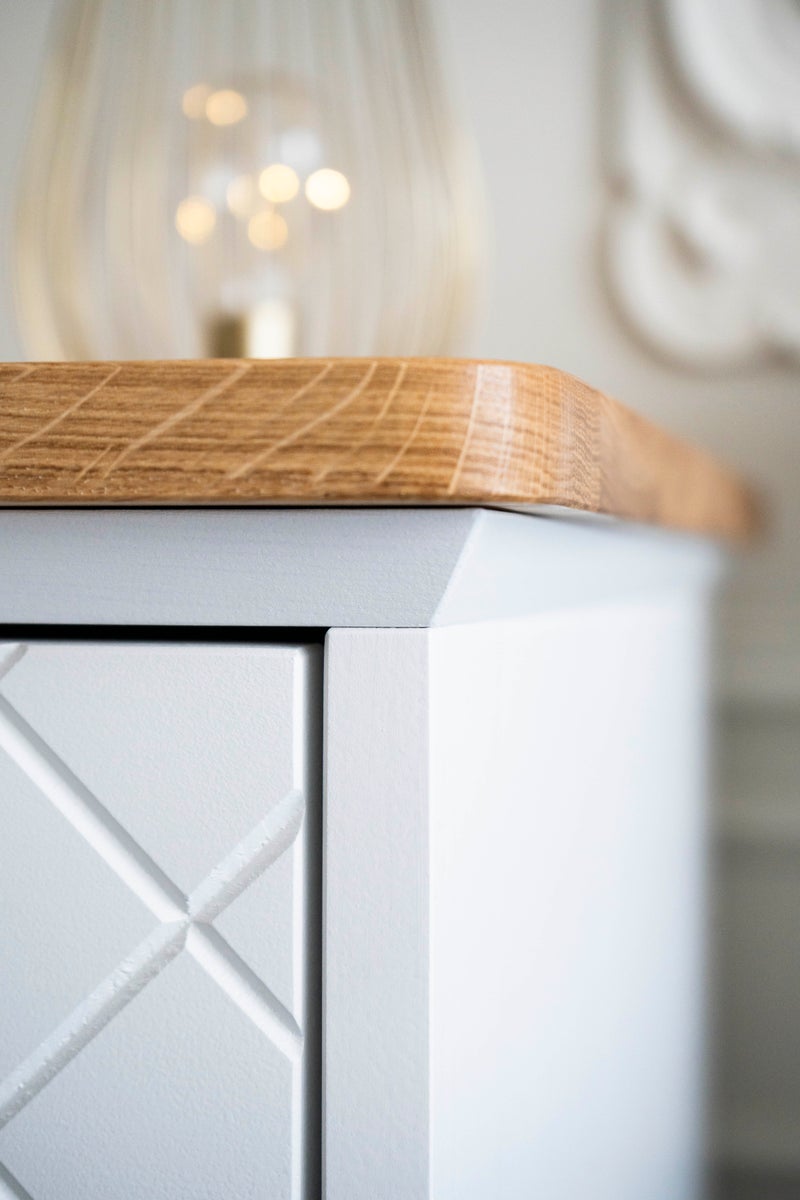 Kolme tilavaa laatikkoa tekevät arjen säilytyksestä sujuvaa. Soft Close-liukukiskot lisäävät käyttömukavuutta ja viimeistelevät laadukkaan käyttökokemuksen. Luonnollinen tammensävyinen kansi tuo lipastoon kauniin kontrastin ja korostaa puun aitoa ilmettä.