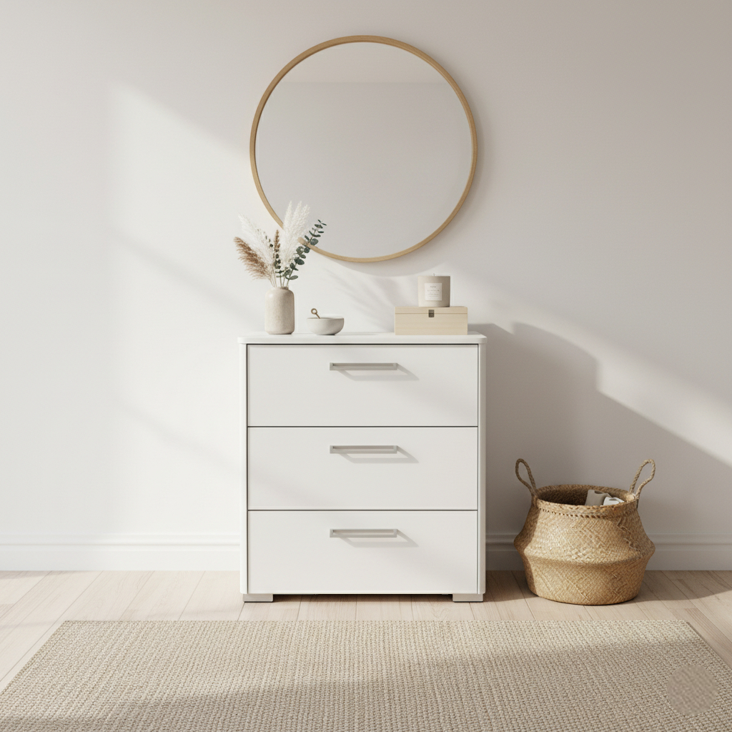 Tyylikkäästi suunniteltu, Kotimainen Helmi-lipasto tarjoaa kätevän säilytysratkaisun kolmessa tilavassa laatikossa. Voit hyödyntää tätä monikäyttöistä lipastoa niin makuuhuoneessa yöpöytänä kuin muissakin tiloissa. Kotimaisen laatutyön tulos näkyy huolellisesti viimeistellyissä kalusteissa, joiden sivujen etureunat ja kansien nurkat on pyöristetty hienovaraisesti. Käytännöllisyyden ohella ulkonäkö on tärkeää, ja Helmi-sarjan kalusteissa yhdistyvät maalattu mdf-levy, hdf-levyn tausta ja valkoiset E1-luokan kalustelevyt. Kestävät alumiinin väriset metallivetimet täydentävät kokonaisuuden. Lipasto toimitetaan valmiiksi koottuna, joten voit heti nauttia sen tuomasta jämäkkyydestä ja tyylikkyydestä. Tarvitsee asentaa vain vetimet, ja lipasto on käyttövalmis.