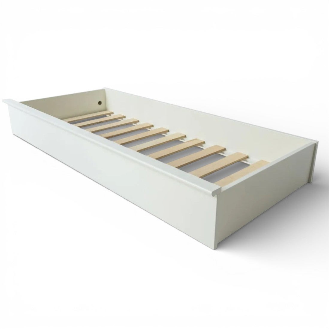 Arjessa tärkeintä on helppous. Tilava laatikko tarjoaa käytännöllisen säilytyspaikan vuodevaatteille, peitoille ja tekstiileille ilman että tila näyttää täyteen ahdetulta. Mäntyinen sälepohja tukee sisältöä, ja pyörien ansiosta laatikko liukuu kevyesti esiin myös päivittäisessä käytössä.
