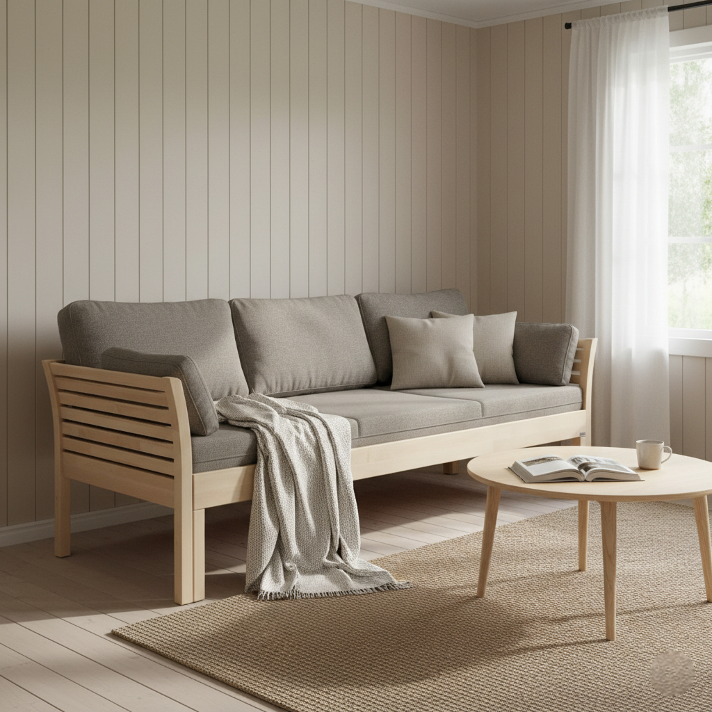 Kotimainen, laadukas Kanerva-vuodesohva sopii kotiin, mökille tai julkitilakalusteeksi. Kaunis ja ajaton muotoilu sopii moneen eri tilaan ja tunnelmaan. Käytännöllinen puusohva muuntuu käteväksi vuoteeksi vieraille hetkessä. Tukeva Kanerva-sohva on valmistettu massiivikoivusta.